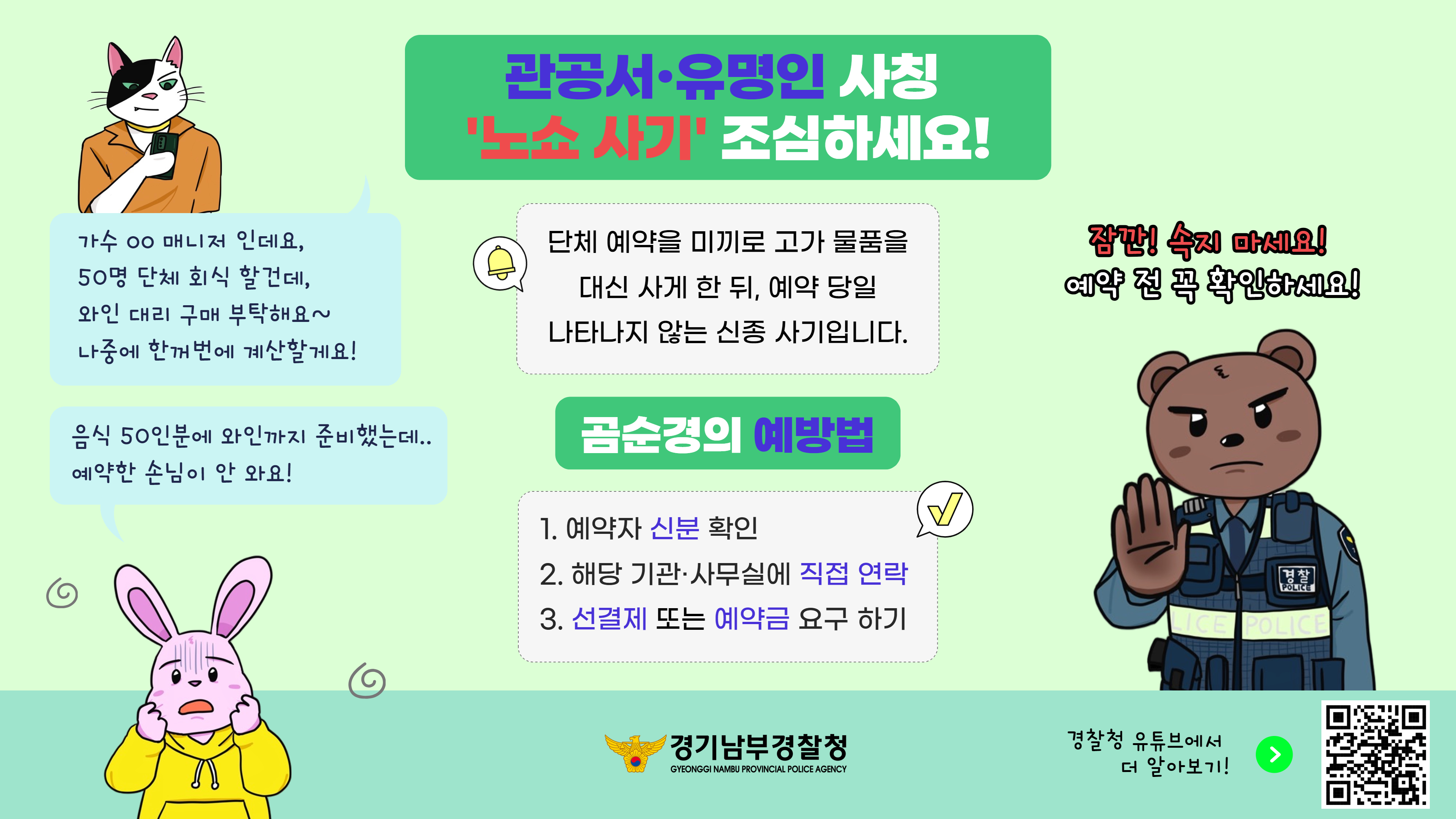 * 노쇼사기란? 단체 예약을 미끼로 고가 물품을 대신 사게 한 뒤, 예약 당일 나타나지 않는 신종 사기를 뜻합니다. [노쇼사기 예방법] 1. 예약자 신분 확인 2. 해당 기관, 사무실에 직접 연락 3. 선결재 또는 예약금 요구하기 노쇼사기 범죄로 인해 피해가 발생하지 않도록 예방하시기 바랍니다. |