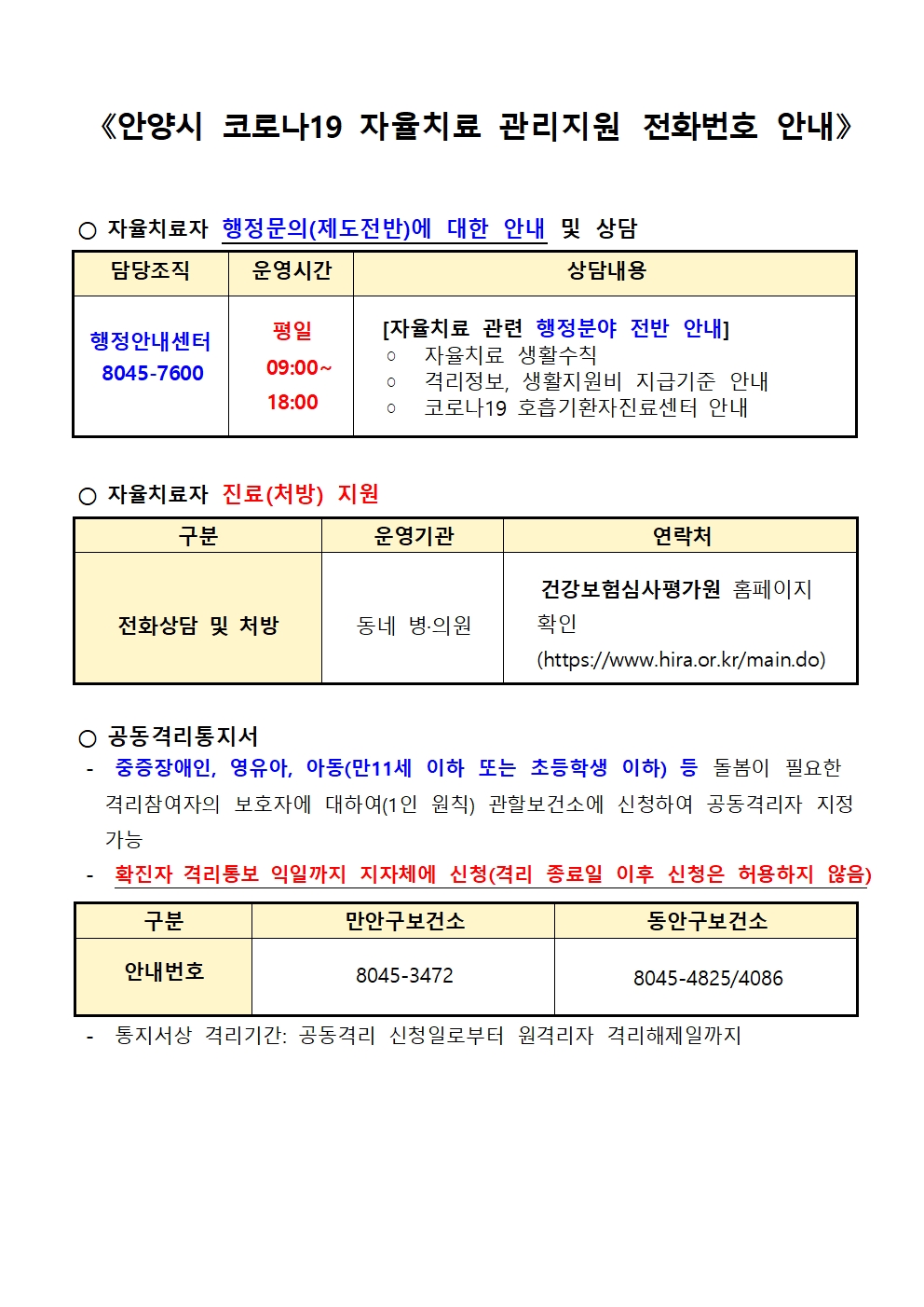 ※ `23.12.30.(토)부터 보건소 선별진료소 운영종료구분 | 만안구보건소 | 동안구보건소 | 안양샘병원 | 한림대학교 성심병원 | |