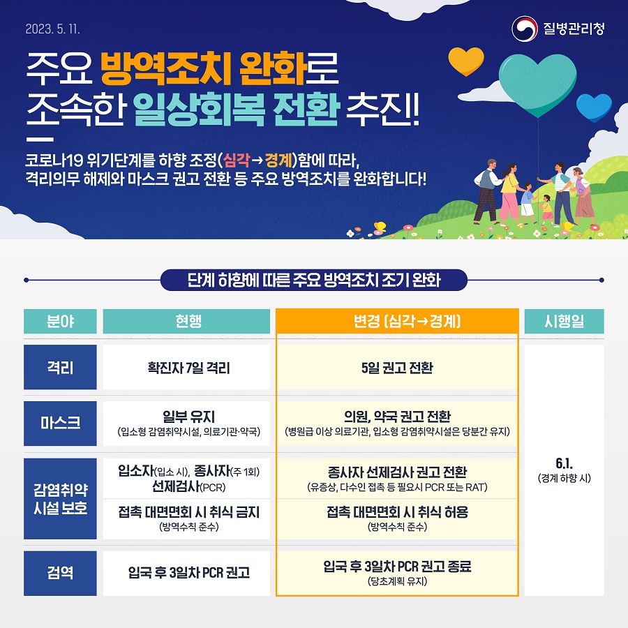 - 코로나19가 4급 감염병으로 전환되더라도, 위기단계 하향(경계주의) 전까지 보건소 선별진료소가 운영되므로, 우선순위 검사대상에 해당되는 경우 무료로 검사를 받으실 수 있습니다.
