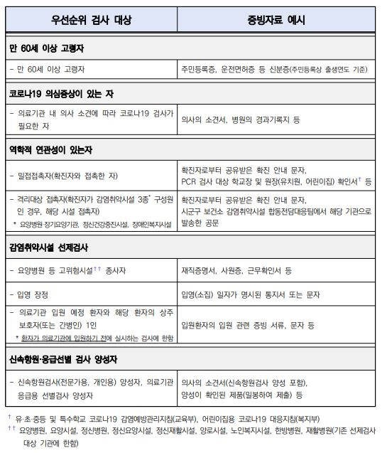 - 단, 우선순위 대상이 일부 조정되어, 보건소 선별진료소는 고위험군 및 감염취약층 보호를 위한 검사를 중심으로 운영됩니다.
