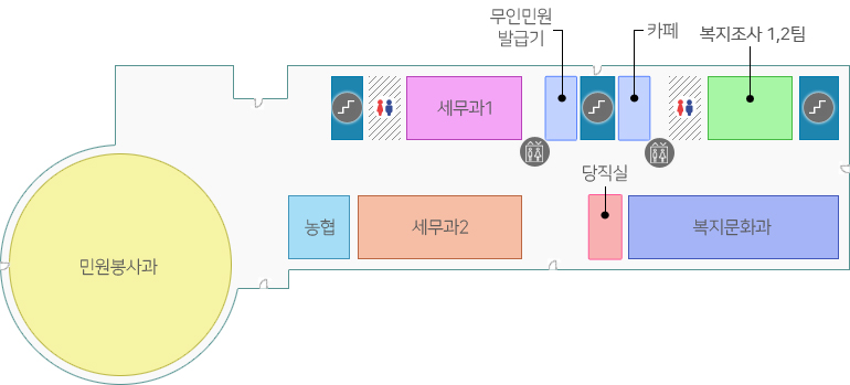 민원봉사과, 세무과1(세무행정팀, 지방소득세팀, 재산세팀), 세무과2(도세팀, 시세팀, 체납관리팀), 차량지원실, 복지조사1, 2팀, 복지문화과, 농협