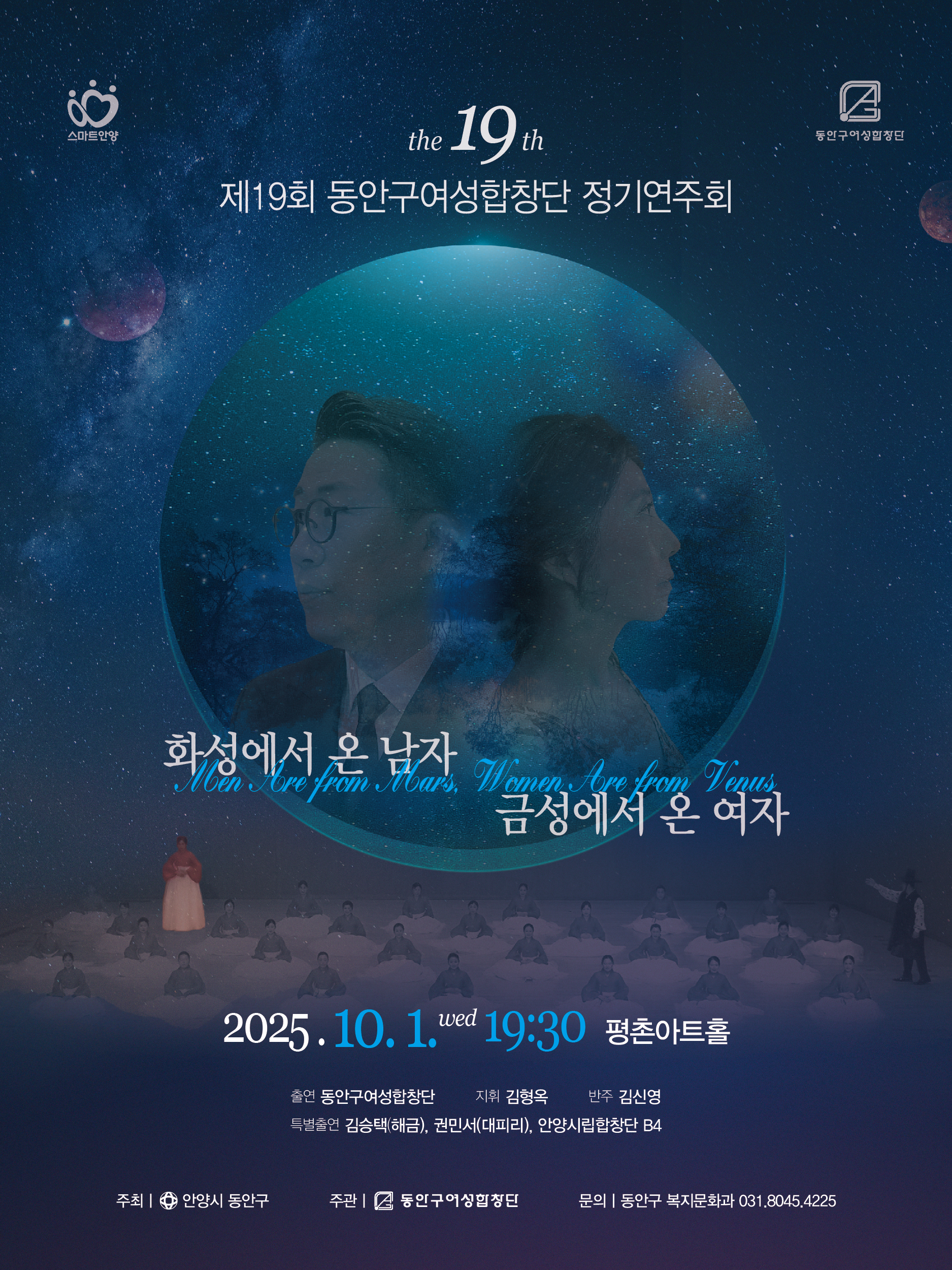 「제19회 동안구여성합창단 정기연주회」에 여러분을 초대합니다. "화성에서 온 남자, 금성에서 온 여자" 서로의 곁을 떠나야 했던 이별의 순간, 그 뒤에 남은 짙은 그리움과 시간이 흐르며 더욱 선명해지는 아련한 추억을 노래합니다. 부디 참석하시어, 깊어가는 가을의 밤 잊지 못할 감동을 나누시길 바랍니다. 1. 일시 : 2025. 10. 1.(수) 19:30~21:00 2. 장소 : 평촌아트홀 (자유공원 내) 3. 출연 : 동안구여성합창단 30명(지휘 김형옥) 및 특별출연(안양시립합창단 B4, 안산시립국악단 김승택(해금), 권민서(대피리)) 4. 연주곡 : "Stars" 등 15곡 (부제 : 화성에서 온 남자 금성에서 온 여자) 5. 대상 : 시민 누구나 (전석 무료) ▣ 주최 : 안양시 동안구 ▣ 주관 : 안양시 동안구여성합창단 ▣ 문의 : 동안구 복지문화과(031-8045-4225) |