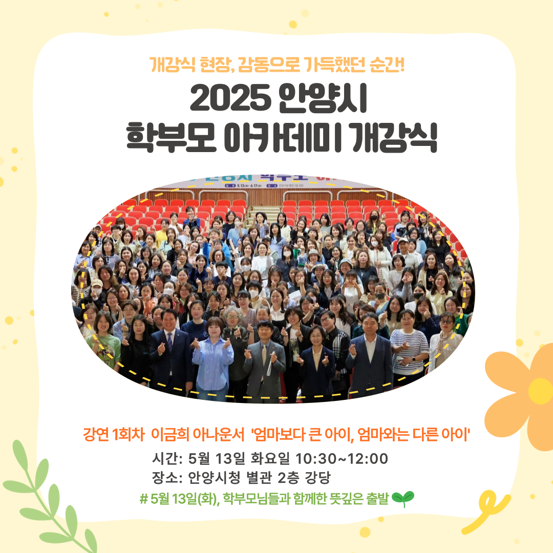 안양시 인재육성재단(이사장 최대호)은 5월 13일 오전 10시 30분, 안양시청 별관 2층 강당에서 관내 예비초·초·중·고등학교 자녀를 둔 학부모 700여 명이 참석한 가운데 ‘2025 안양시 학부모 아카데미’ 개강식을 성황리에 개최했다.