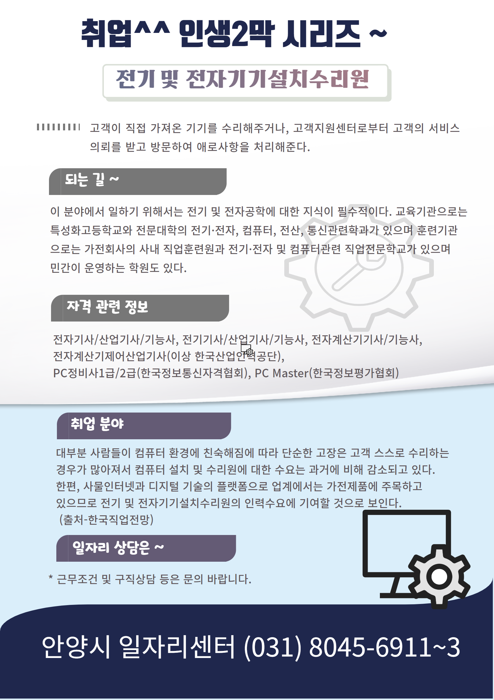 자료실 링크복사 인쇄 블로그 페이스북 트위터 카카오스토리 카카오톡 로그인 알림마당 > 자료실 상세보기 - 제목, 내용, 작성일, 파일 정보 제공 [직업정보] 인생2막시리즈20_전기 및 전자기기설치수리원 작성일 : 2020-08-11 내용 사진 확대보기 파일 png 파일 전자기기설치수리원.png 미리보기 (파일크기 : 391.8KB, 다운로드 : 320회) 목록 이전글 [직업정보] 인생2막시리즈19_이용사 및 미용사 다음글 안양 청년 면접 스타일링(헤어&메이크업) 지원사업 이용업체 안내