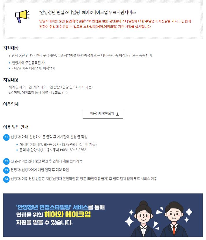 자료실 링크복사 인쇄 블로그 페이스북 트위터 카카오스토리 카카오톡 로그인 알림마당 > 자료실 상세보기 - 제목, 내용, 작성일, 파일 정보 제공 ‘안양청년 면접스타일링’ 헤어&메이크업 무료지원서비스 작성일 : 2024-09-05 내용 안양 청년 면접스타일링 바로가기 사진 확대보기 파일 jpg 파일 캡처.JPG 미리보기 (파일크기 : 74.5KB, 다운로드 : 65회) pdf 파일 2024 메이크업및헤어지원참여업체.pdf 미리보기 (파일크기 : 35.0KB, 다운로드 : 266회) 목록 이전글 안양 청년 면접 스타일링(헤어&메이크업) 지원사업 이용업체 안내 다음글 [민원서식] 구인신청서
