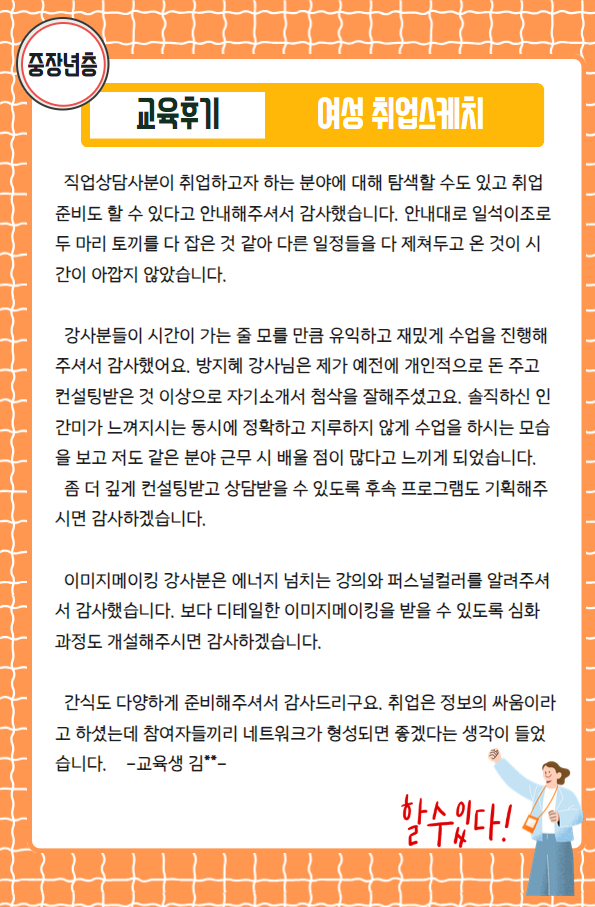 사진첩 링크복사 인쇄 블로그 페이스북 트위터 카카오스토리 카카오톡 알림마당 > 갤러리 상세보기 - 제목, 내용, 파일 정보 제공 [교육후기/여성층]취업스케치 2기 내용 6/30~7/2 여성 취업스케치 2기 사진 확대보기 파일 jpg 파일 취업스케치 후기2.jpg 미리보기 (파일크기 : 566.0KB, 다운로드 : 20회) 목록 이전글 [교육후기/여성층]취업스케치 2기 다음글 [교육후기/청년층] 청년안정 취업학교 3기