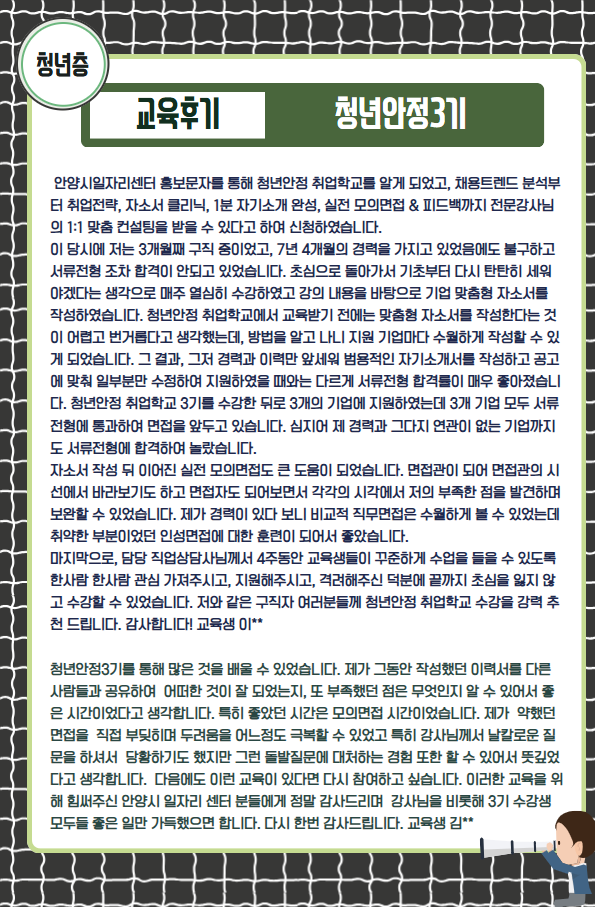 사진첩 링크복사 인쇄 블로그 페이스북 트위터 카카오스토리 카카오톡 알림마당 > 갤러리 상세보기 - 제목, 내용, 파일 정보 제공 [교육후기/청년층] 청년안정 취업학교 3기 내용 청년안정 취업학교 3기 사진 확대보기 파일 png 파일 [청년]교육후기_청년안정3기.png 미리보기 (파일크기 : 214.5KB, 다운로드 : 1회) 목록 이전글 [교육후기/여성층]취업스케치 2기 다음글 2025 제2회 청년 안양정착 일자리박람회