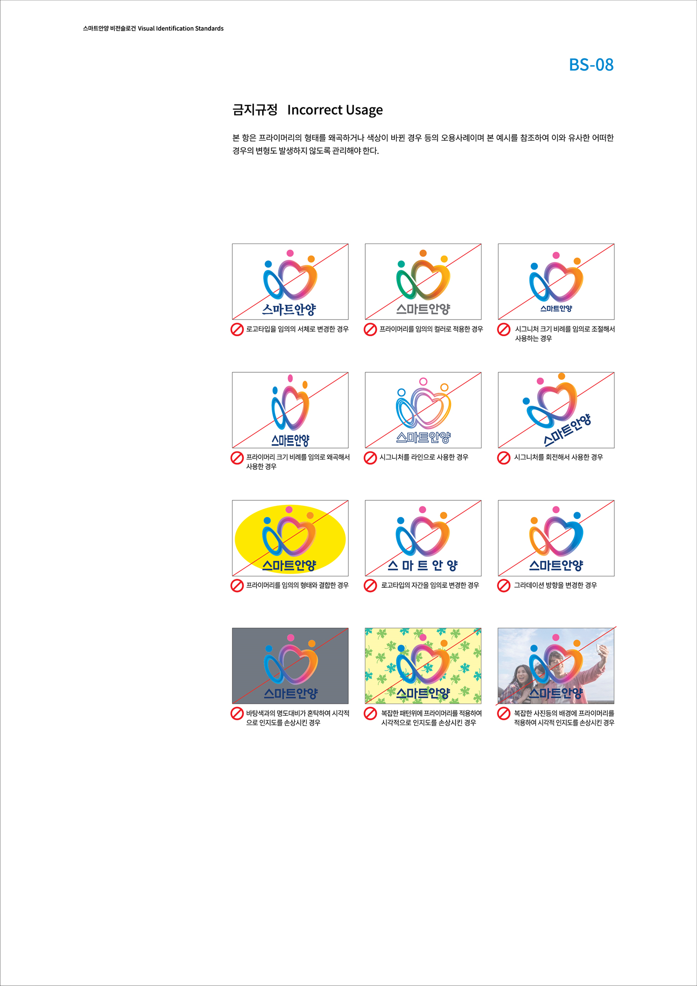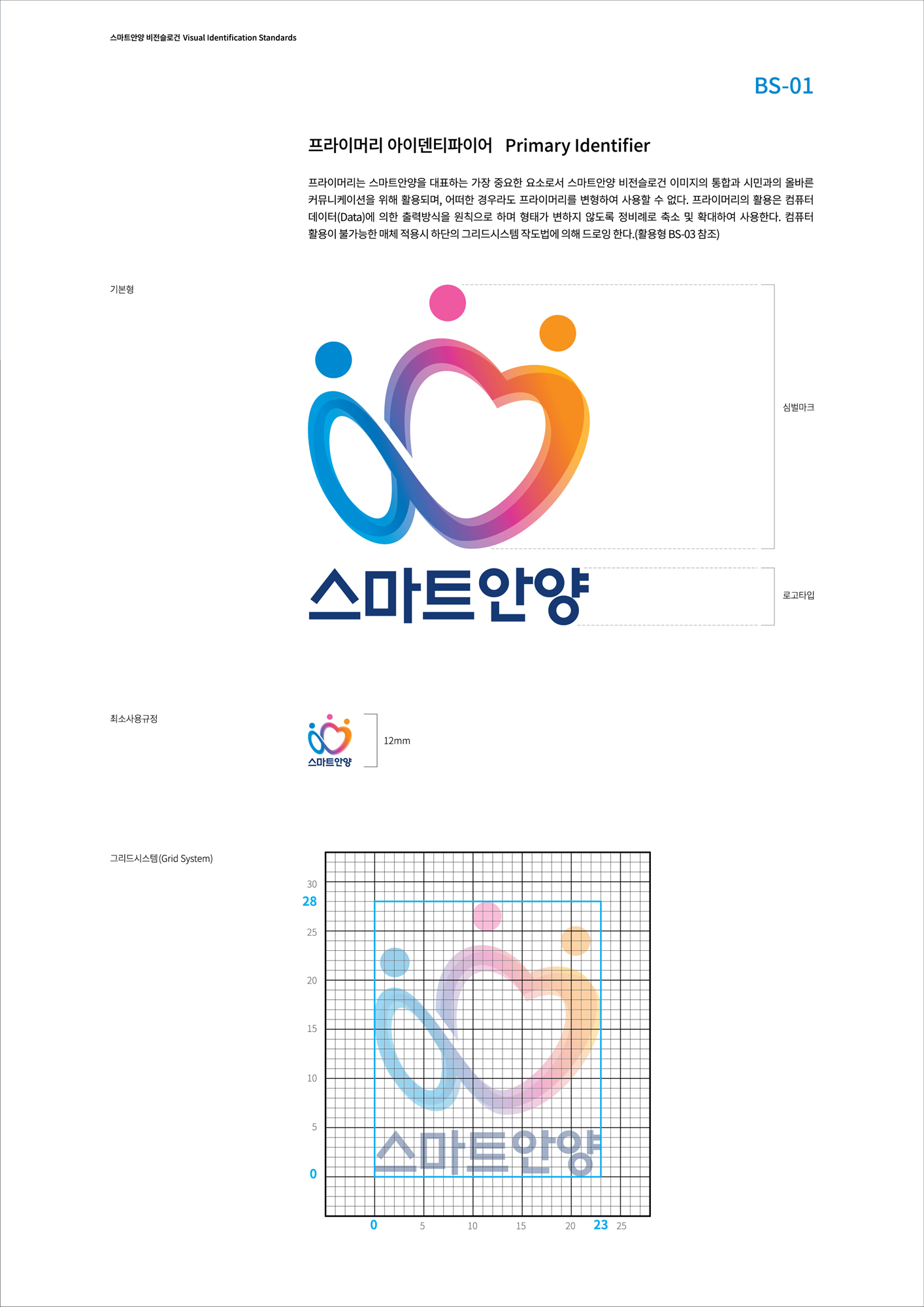 프라이머리는 스마트안양을 대표하는 가장 중요한 요소로서 스마트안양 비전슬로건 이미지의 통합과 시민과의 올바른 커뮤니케이션을 위해 활용되며, 어떠한 경우라도 프라이머리를 변형하여 사용할 수 없다. 프라이머리의 활용은 컴퓨터 데이터(Data)에 의한 출력방식을 원칙으로 하며 형태가 변하지 않도록 정비례로 축소 및 확대하여 사용한다. 컴퓨터 활용이 불가능한 매체 적용시 하단의 그리드시스템 작도법에 의해 드로잉 한다.(활용형 BS-03 참조)