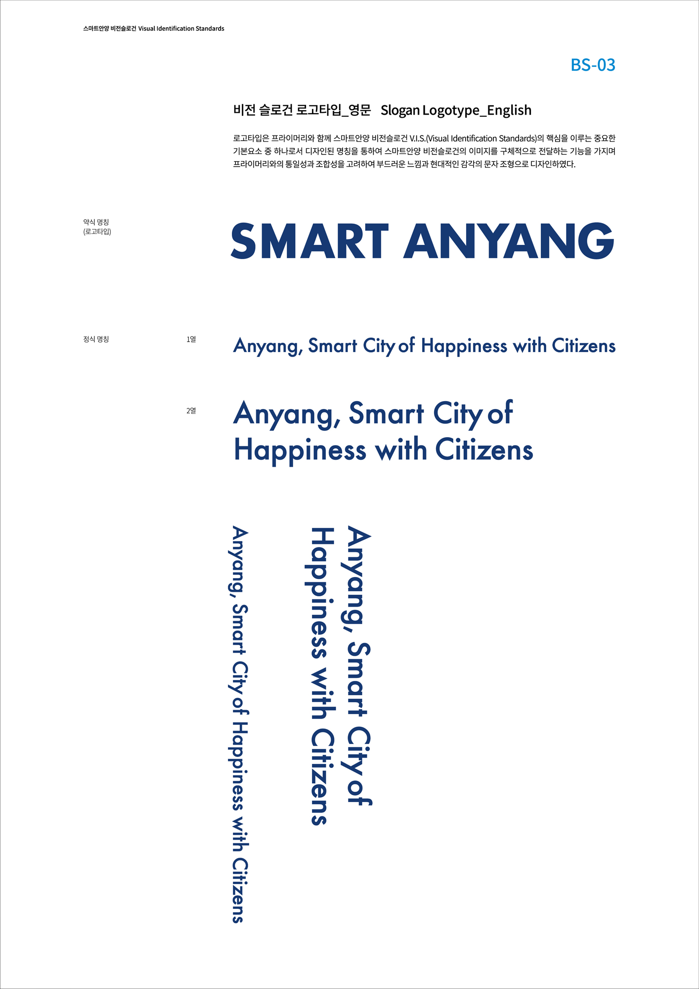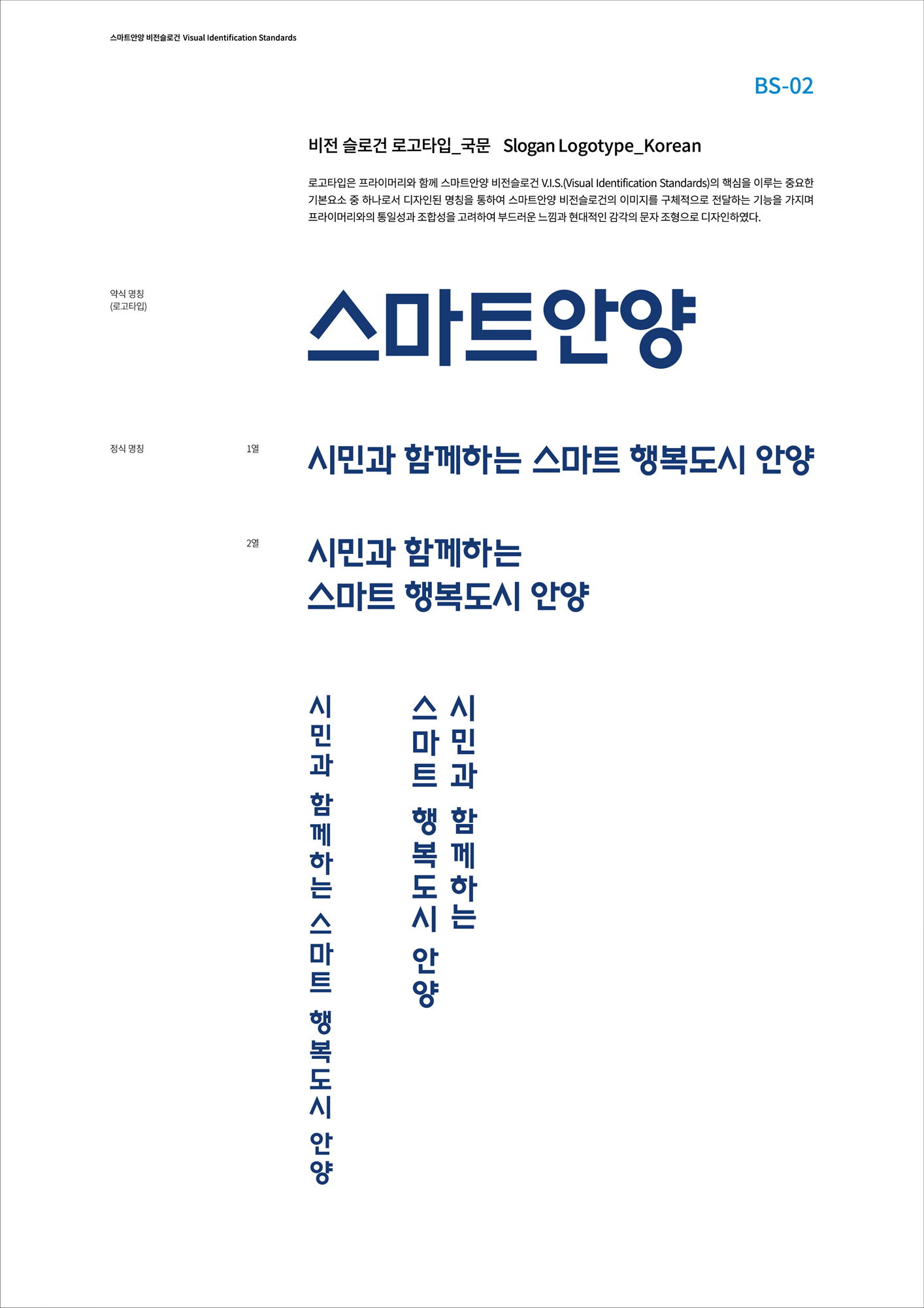 로고타입은 프라이머리와 함께 스마트안양 비전슬로건 V.I.S.(Visual Identification Standards)의 핵심을 이루는 중요한 기본요소 중 하나로서 디자인된 명창을 통하여 스마트안양 비전슬로건의 이미지를 구체적으로 전달하는 기능을 가지며 프라이머리와의 통일성과 조합성을 고려하여 부드러운 느낌과 현대적인 감각의 문자 조형으로 디자인하였다.