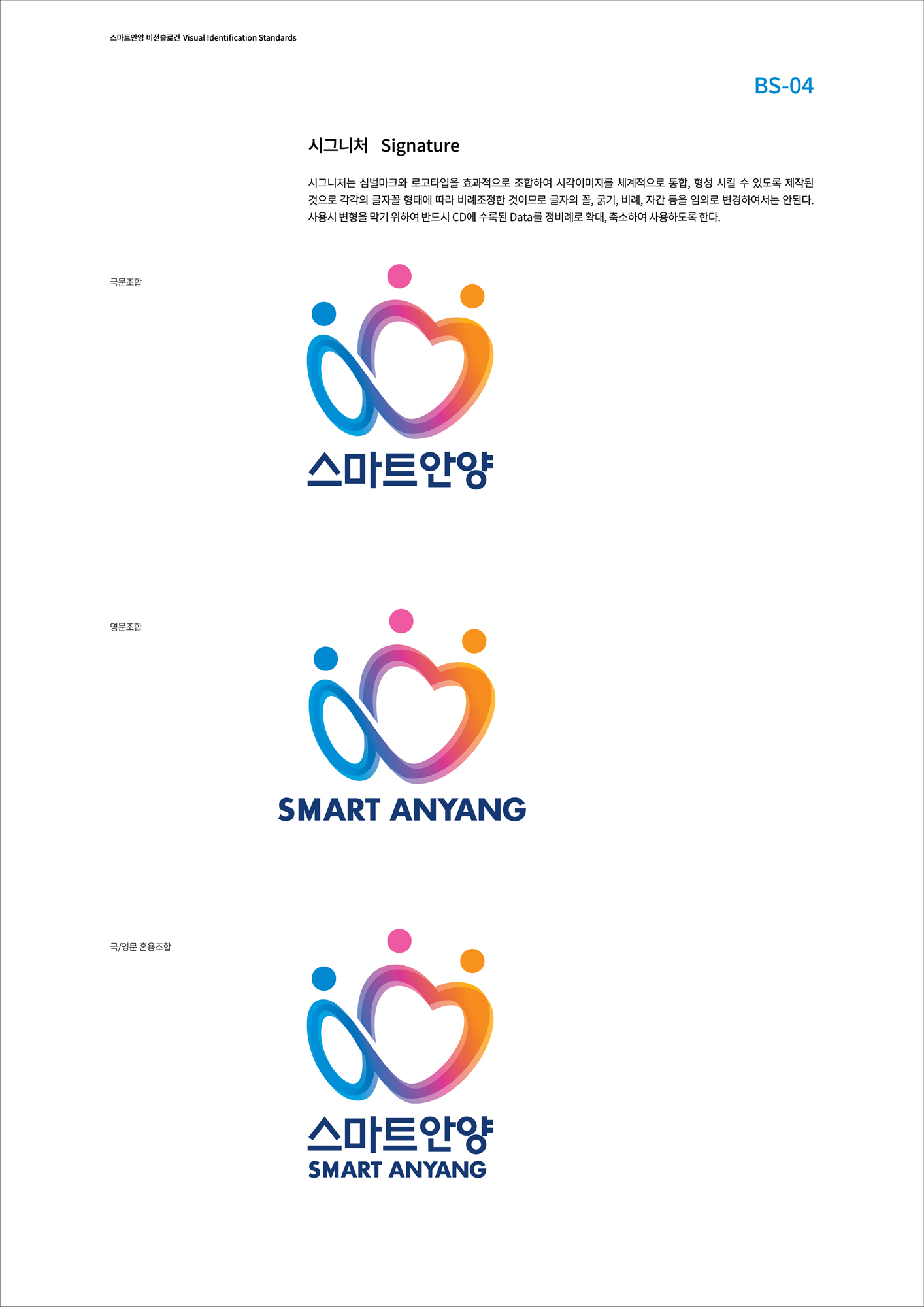 시그니처는 심벌마크와 로고타입을 효과적으로 조합하여 시각이미지를 체계적으로 통합, 형성 시킬 수 있도록 제작된 것으로 각각의 글자꼴 형태 따라 비례조정한 것이므로 글자의 꼴, 굵기, 비례, 자간 등을 임의로 변경하여서는 안된다. 사용시 변형을 막기 위하여 반드시 CD에 수록된 Data를 정비례로 확대, 축소하여 사용하도록 한다.