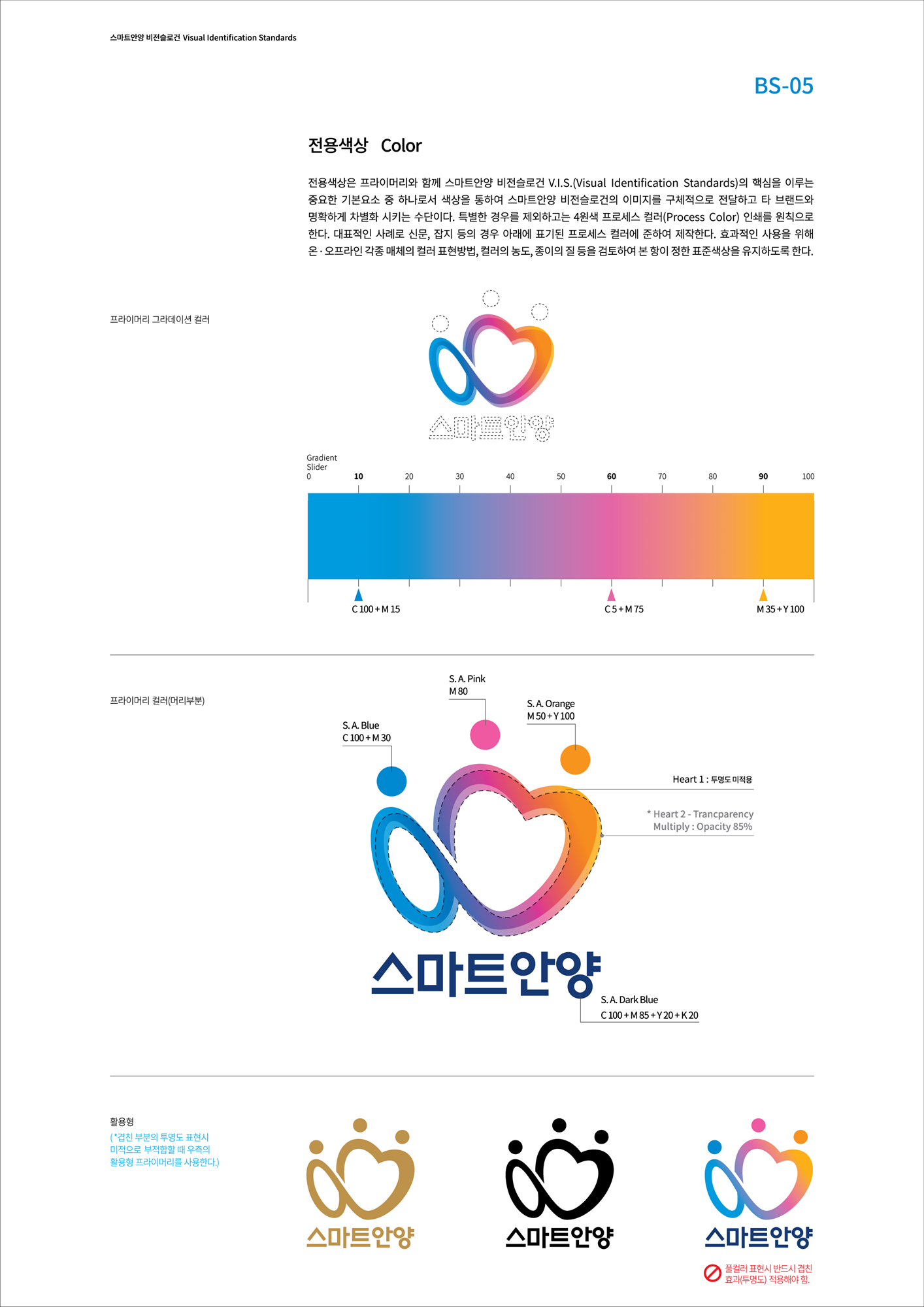 전용색상은 프라이머리와 함께 스마트안양 비젼슬로건 V.I.S(Visual Identification Standards)의 핵심을 이루는 중요한 기본요소 중 하나로서 색상을 통하여 스마트안양 비전슬로건의 이미지를 구체적으로 전달하고 타 브랜드와 명확하게 차별화 시키는 수단이다. 특별한 경우를 제외하고는 4원색 프로세스 컬러(Process Color) 인쇄를 원칙으로 한다. 대표적인 사례로 신문, 잡지 등의 경우 아래에 표기된 프로세스 컬러에 준하여 제작한다. 효과적인 사용을 위해 온·오프라인 각종 매체의 컬러 표현방법, 컬러의 농도, 종이의 질 등을 검토하여 본 항이 정한 표준색상을 유지하도록 한다.