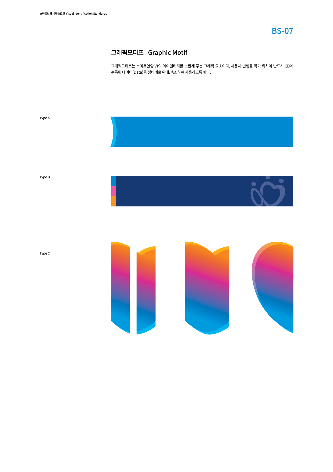 그래픽모티프는 스마트안양Ⅵ의 아이덴티티를 보완해 주는 그래픽 요소이다. 사용시 변형을 막기 위하여 반드시 CD에 수록된 데이터(Data)를 정비례로 확대, 축소하여 사용하도록 한다.