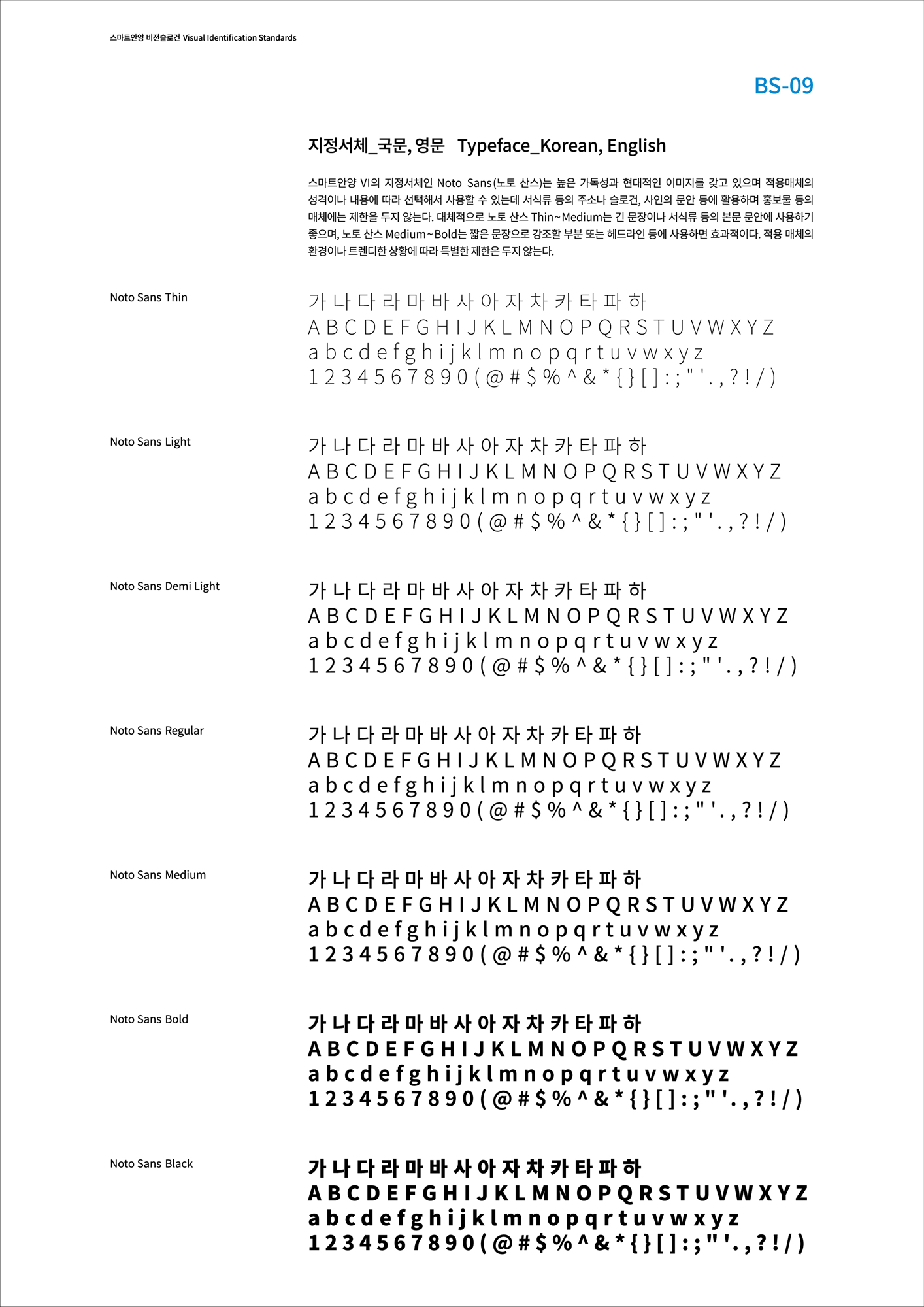 스마트안양Ⅵ의 지정서체인 Noto Sans(노토 산스)는 높은 가독성과 현대적인 이미지를 갖고 있으며 적용매체의 성격이나 내용에 따라 선택해서 사용할 수 있는ㄷ 서식류 등의 주소나 슬로건, 사인의 문안등에 활용하며 홍보물 등의 매체에는 제한을 두지 않는다. 대체적으로 노토 산스 Thin ~Medium는 긴 문장이나 서식류 등의 본문 문안에 사용하기 좋으며, 노토 산스 Medium~Bold는 짧은 문장으로 강조할 부분 또는 헤드라인 등에 사용하며 효과적이다. 적용 매체의 환경이나 트렌디한 상황에 따라 특별한 제한은 두지 않는다.