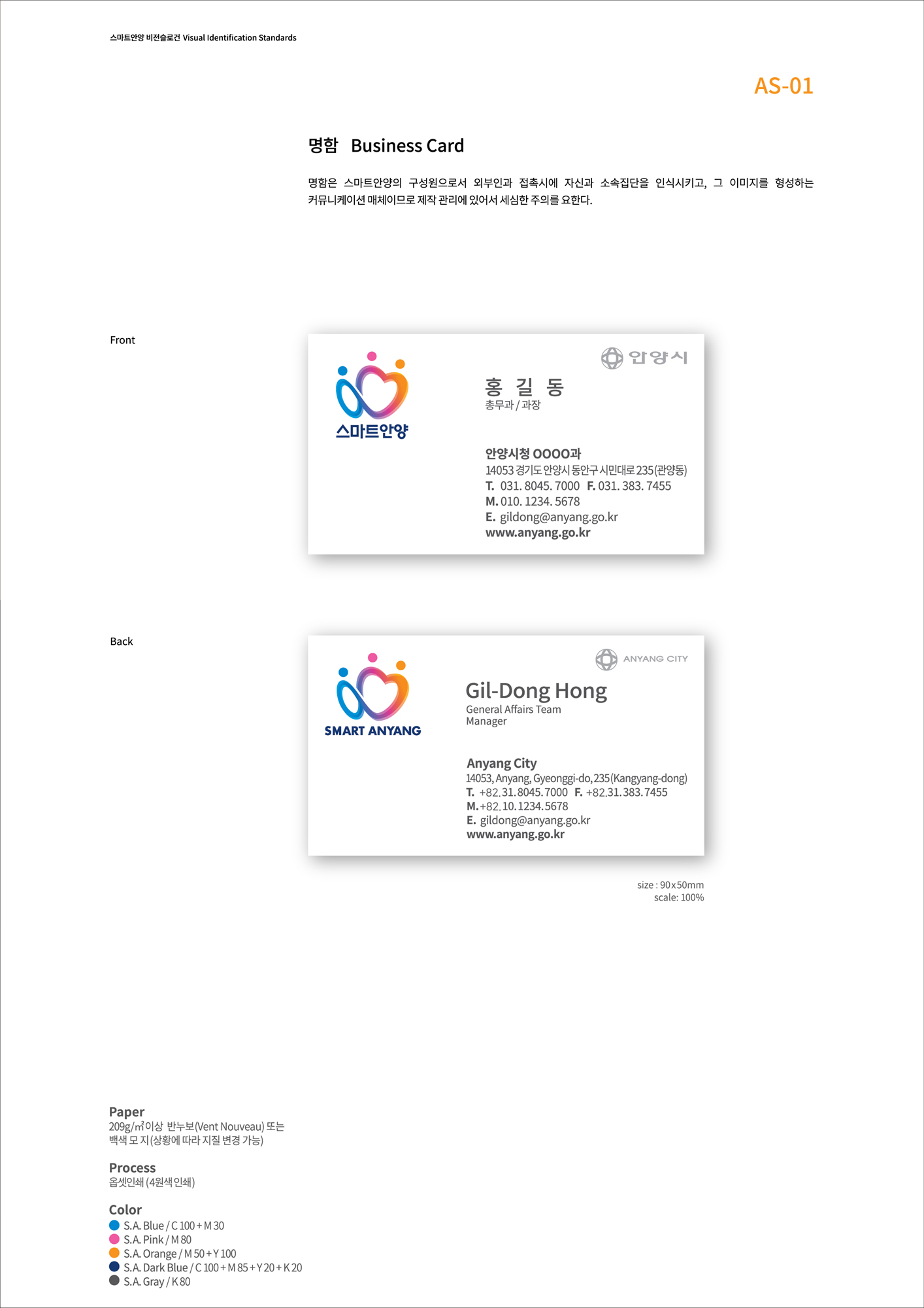 명함은 스마트안양의 구성원으로서 외부인과 접촉시에 자신과 소속집단을 인식시키고, 그 이미지를 형성하는 커뮤니케이션 매체이므로 제작 관리에 있어서 세심한 주의를 요한다.
