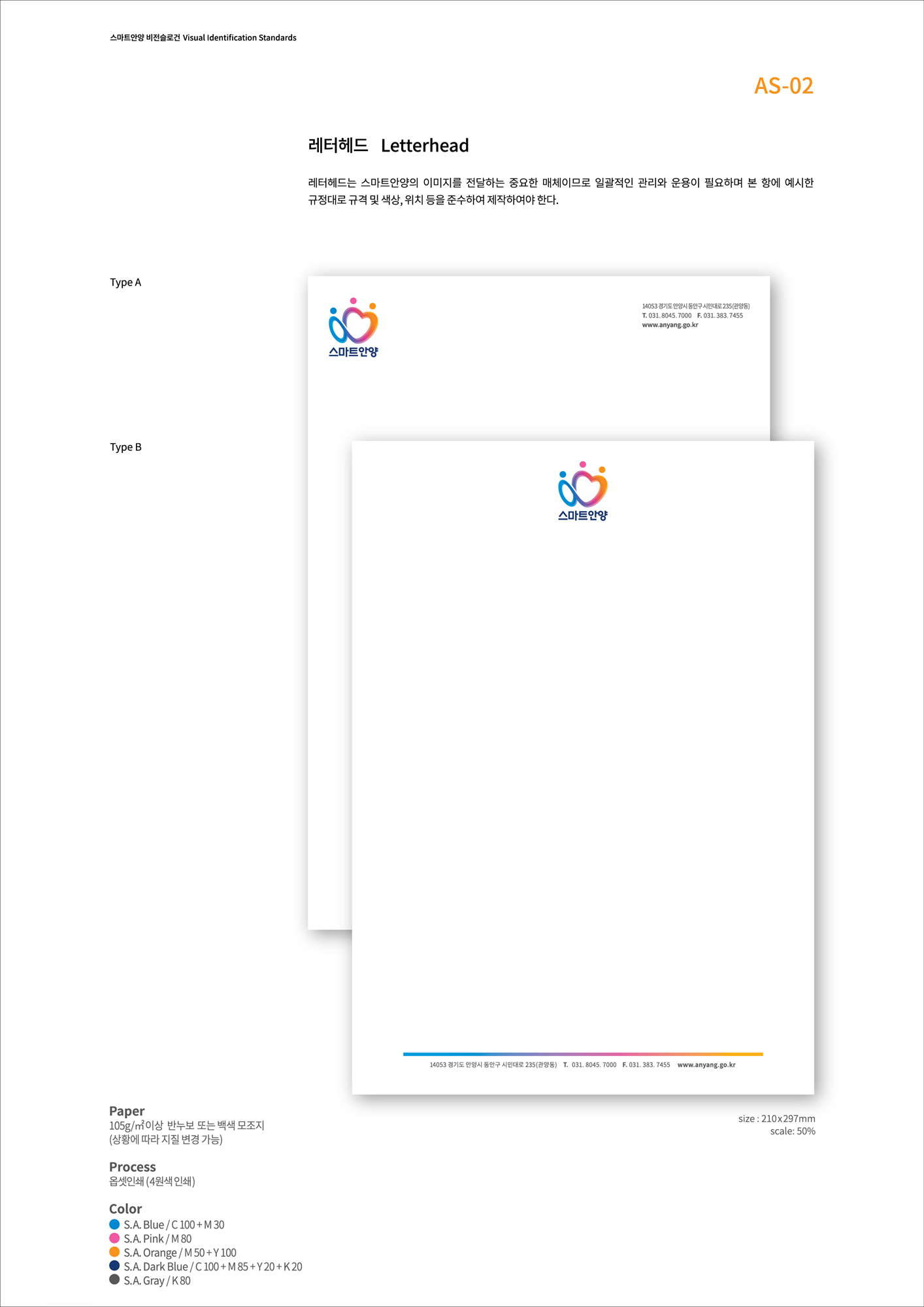 레터헤드는 스마트안양의 이미지를 전달하는 중요한 매체이므로 일괄적인 관리와 운용이 필요하며 본 항에 예시한 규정대로 규격 및 색상, 위치 등을 준수하여 제작하여야 한다.