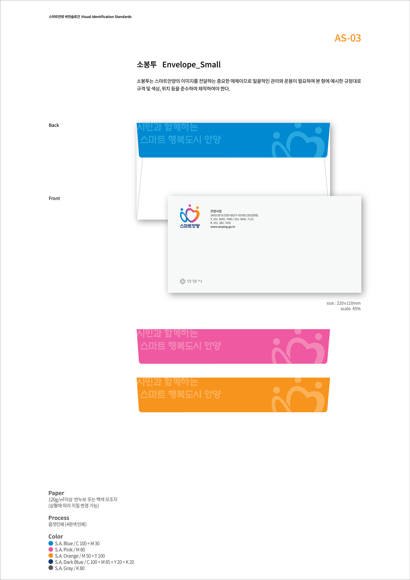 소봉투는 스마트안양의 이미지를 전달하는 중요한 매체이므로 일괄적인 관리와 운용이 필요하며 본 항에 예시한 규정대로 규격 및 색상, 위치 등을 준수하여 제작하여야 한다.