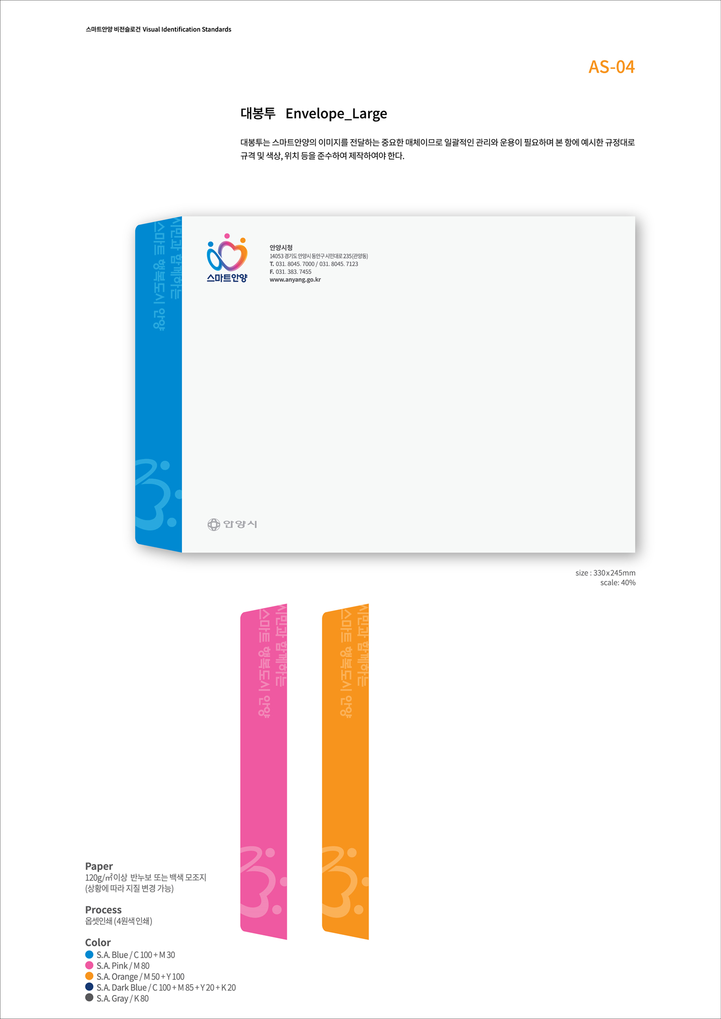 대봉투는 스마트안양의 이미지를 전달하는 중요한 매체이므로 일괄적인 관리와 운용이 필요하며 본 항에 예시한 규정대로 규격 및 색상, 위치 등을 준수하여 제작하여야 한다.
