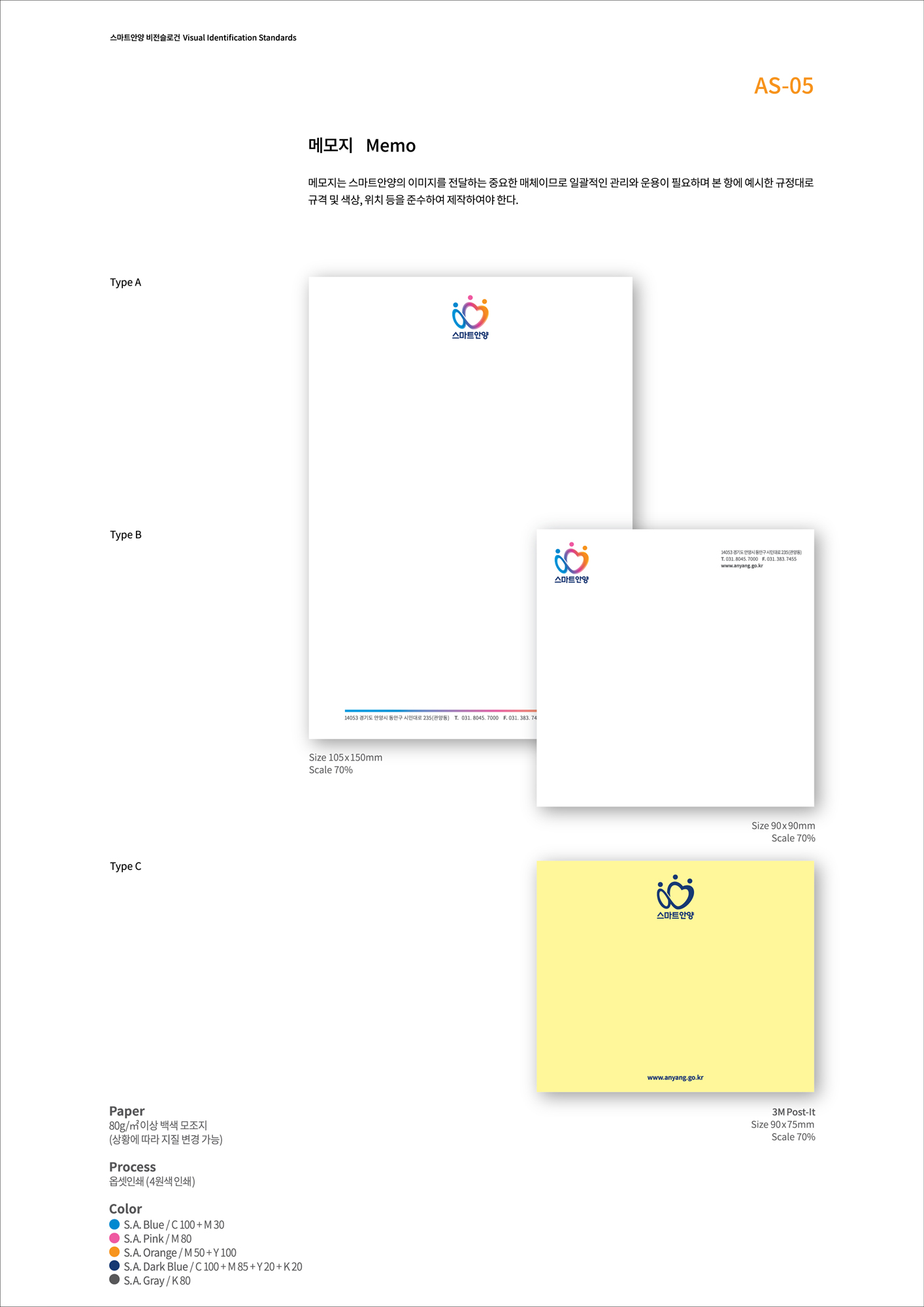 메모지는 스마트안양의 이미지를 전달하는 중요한 매체이므로 일괄적인 관리와 운용이 필요하며 본 항에 예시한 규정대로 규격 및 색상, 위치 등을 준수하여 제작하여야 한다.