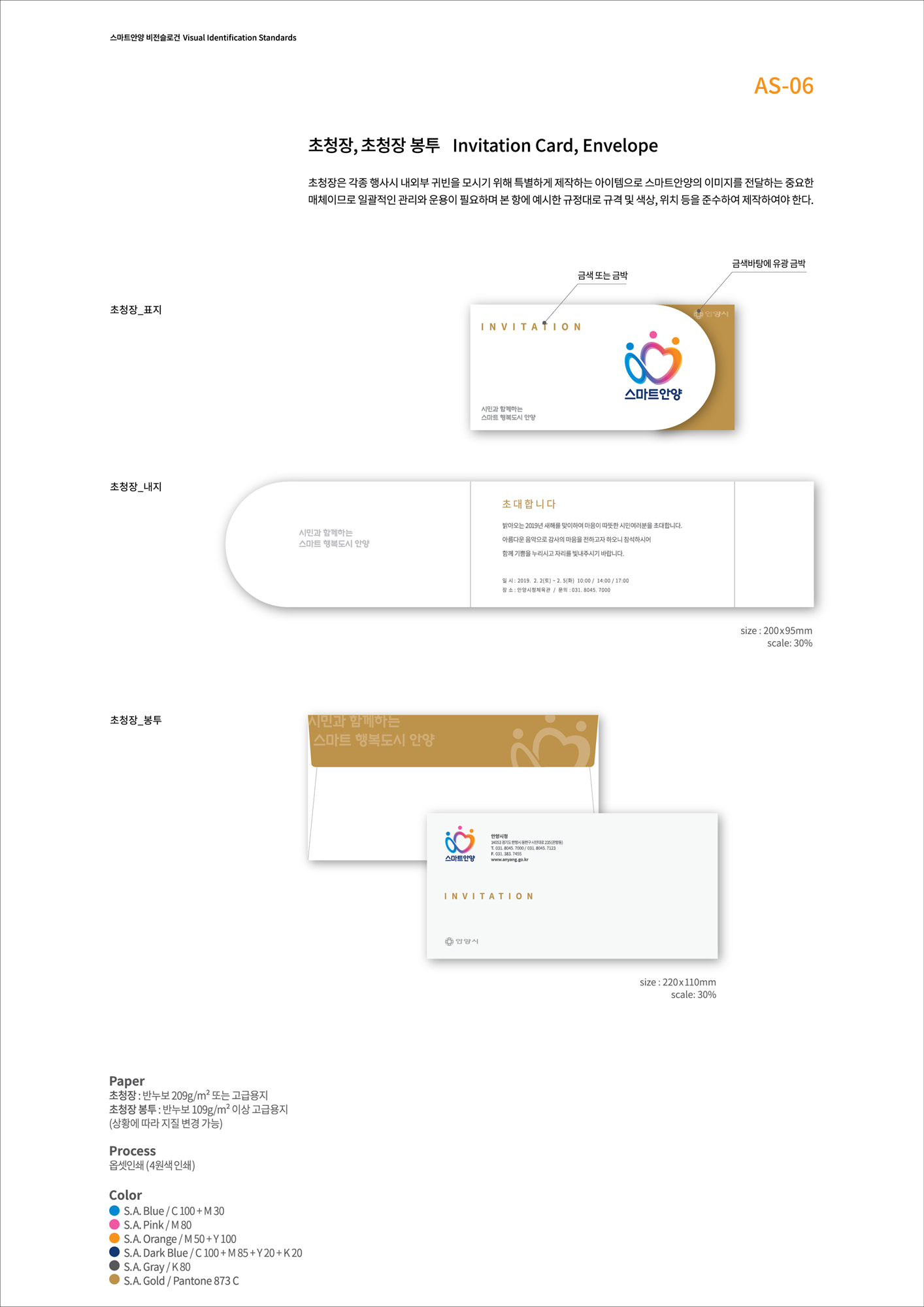 초청장은 각종 행사시 내외부 귀빈을 모시기 위해 특별하게 제작하는 아이템으로 스마트안양의 이미지를 전달하는 중요한 매체이므로 일괄적인 관리와 운용이 필요하며 본 항에 예시한 규정대로 규격 및 색상, 위치 등을 준수하여 제작하여야 한다.
