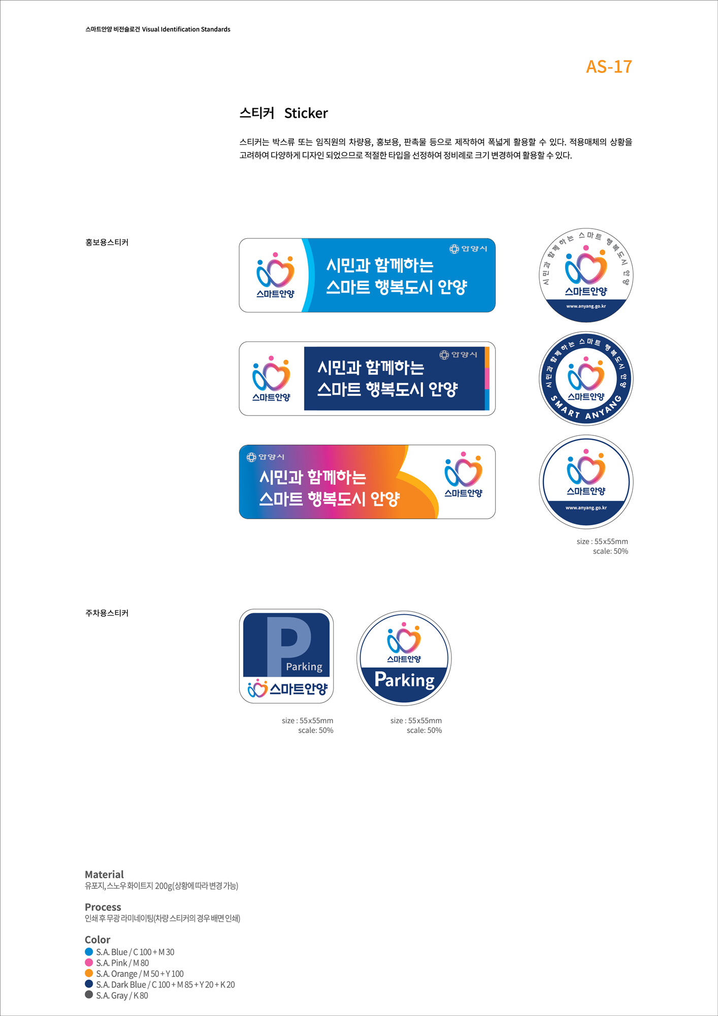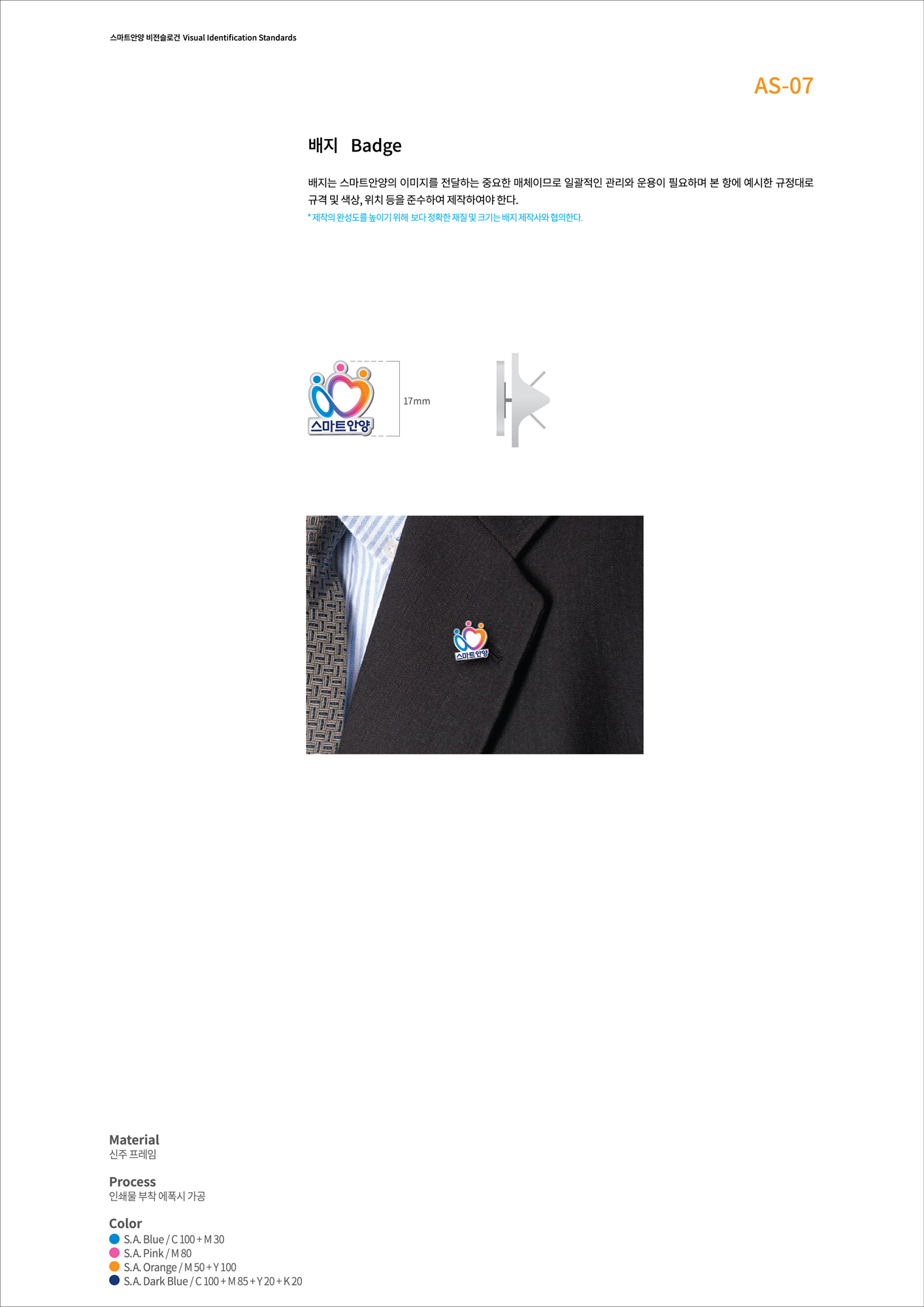 배지는 스마트안양의 이미지를 전달하는 중요한 매체이므로 일괄적인 관리와 운용이 필요하며 본 항에 예시한 규정대로 규격 및 색상, 위치 등을 준수하여 제작하여야 한다.