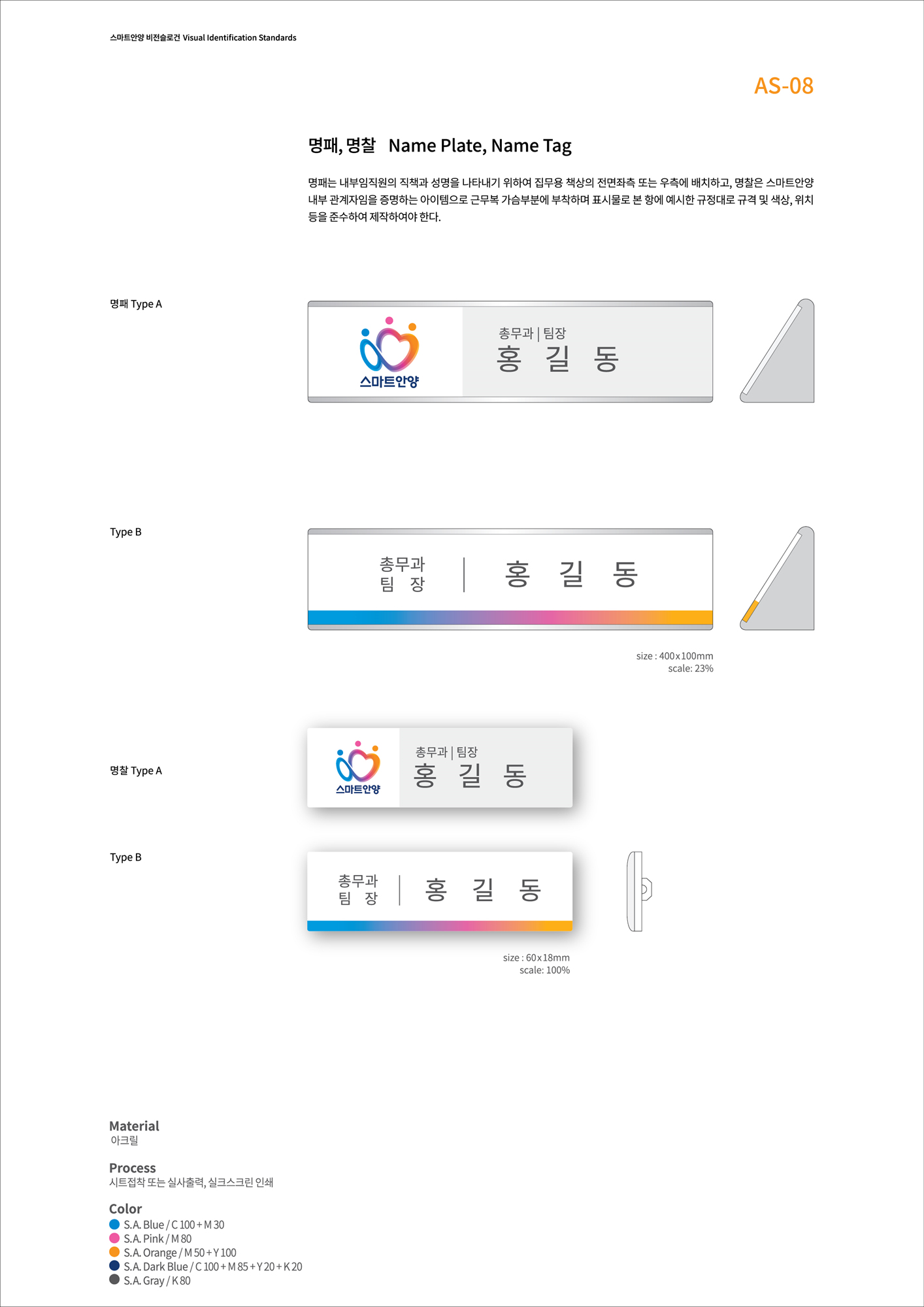 명패는 내부임직원의 직책과 성명을 나타내기 위하여 집무용 책상의 전면좌측 또는 우측에 배치하고, 명찰은 스마트안양 내부 관계자임을 증명하는 아이템으로 근무복 가슴부분에 부탁하며 표시물로 본 항에 예시한 규정대로 규격 및 색상, 위치 등을 준수하여 제작하여야 한다.