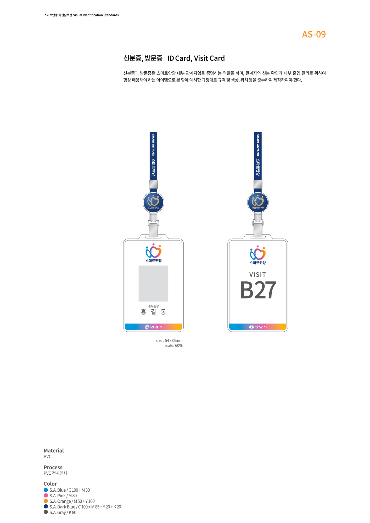 신분증과 방문증은 스마트안양 내부 관계자임을 증명하는 역할을 하며, 관계자의 신분 확인과 내부 출입 관리를 위하여 항상 패용해야 하는 아이템으로 본 항에 예시한 규정대로 규격 및 색상, 위치 등을 준수하여 제작하여야 한다.