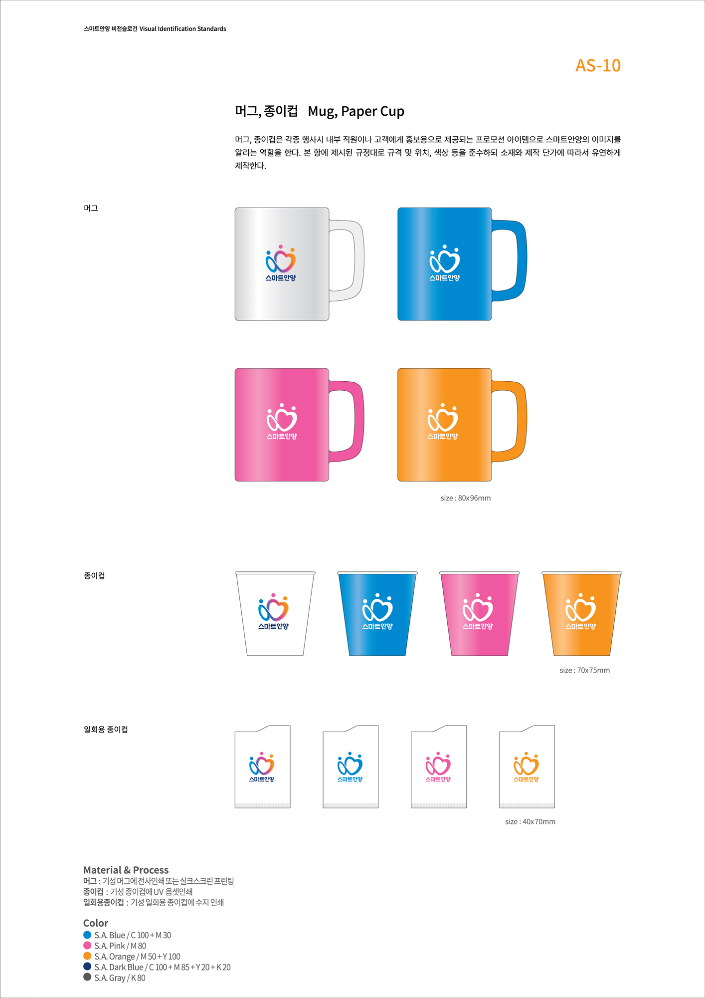 머그, 종이컵은 각종 행사시 내부 직원이나 고객에게 홍보용으로 제공되는 프로모션 아이템으로 스마트안양의 이미지를 알리는 역할을 한다. 본 항에 제시된 규정대로 규격 및 위치, 색상 등을 준수하되 소재와 제작 단가에 따라서 유연하게 제작한다.