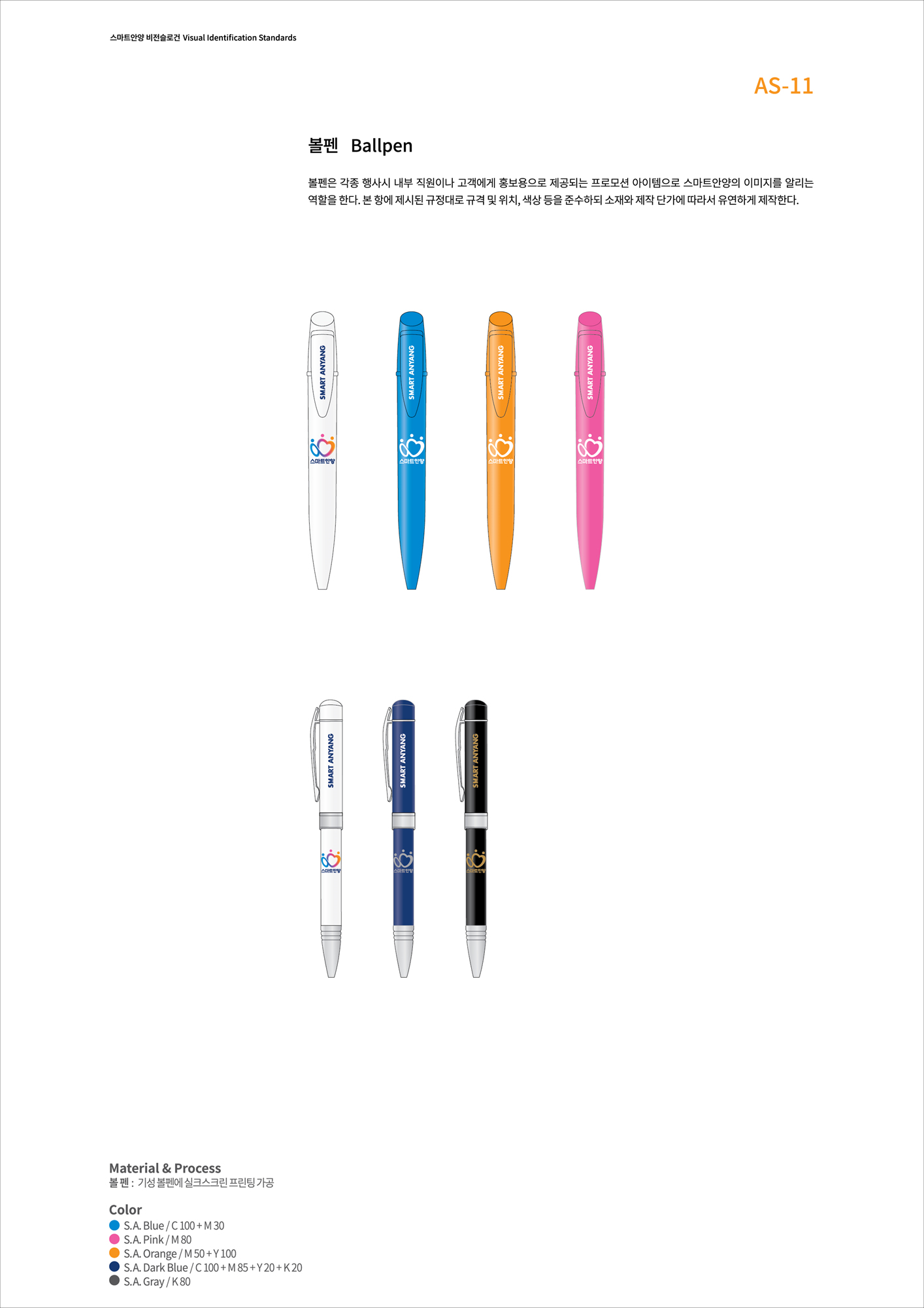 볼펜은 각종 행사시 내부 직원이나 고객에게 홍보용으로 제공되는 프로모션 아이템으로 스마트안양의 이미지를 알리는 역할을 한다. 본 항에 제시된 규정대로 규격 및 위치, 색상 등을 준수하되 소재와 제작 단가에 따라서 유연하게 제작한다.