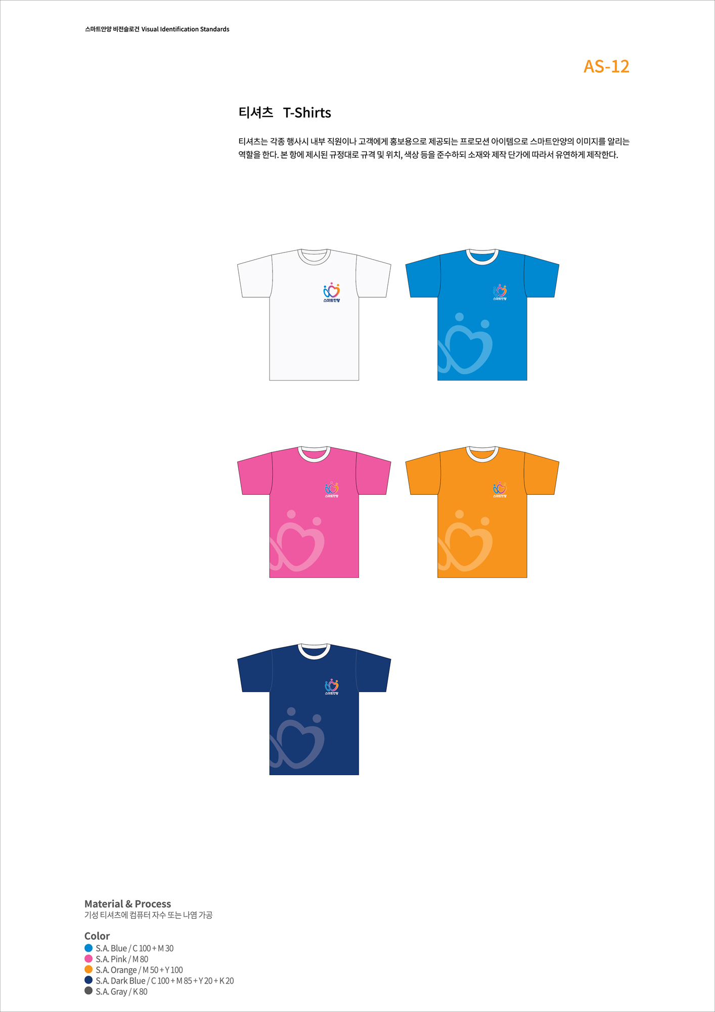 티셔츠는 각종 행사시 내부 직원이나 고객에게 홍보용으로 제공되는 프로모션 아이템으로 스마트안양의 이미지를 알리는 역할을 한다. 본 항에 제시된 규정대로 규격 및 위치, 색상 등을 준수하되 소재와 제작 단가에 따라서 유연하게 제작한다.