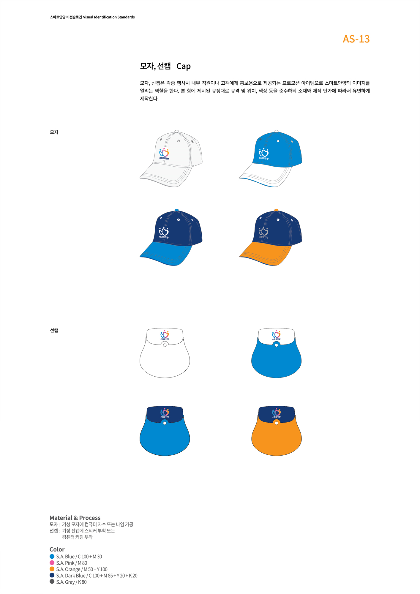 모자, 선캡은 각종 행사시 내부 직원이나 고객에게 홍보용으로 제공되는 프로모션 아이템으로 스마트안양의 이미지를 알리는 역할을 한다. 본 항에 제시된 규정대로 규격 및 위치, 색상 등을 준수하되 소재와 제작 단가에 따라서 유연하게 제작한다.