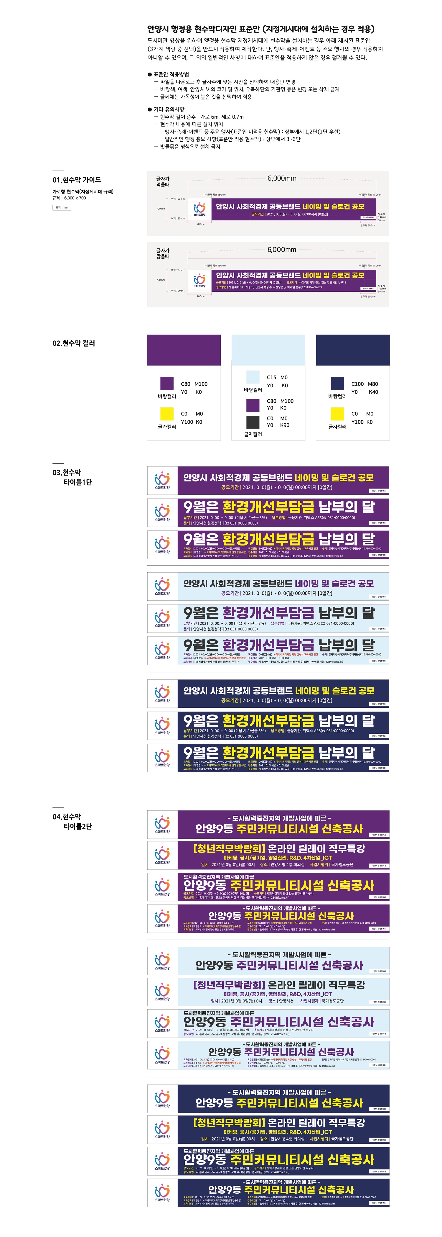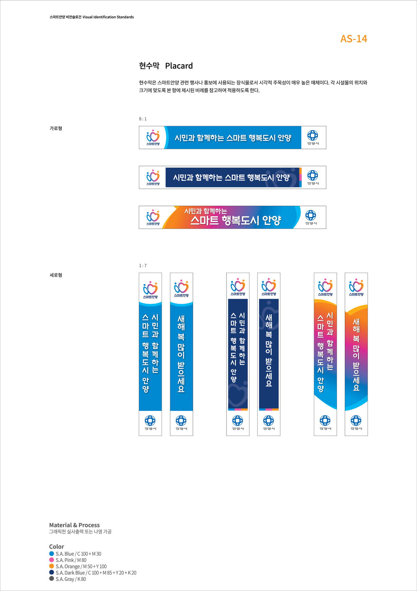 현수막은 스마트안양 관련 행사나 홍보에 사용되는 장식물로서 시각적 주목성이 매우 높은 매체이다. 각 시설물의 위치와 크기에 맞도록 본 항에 제시된 비례를 참고하여 적용하도록 한다.