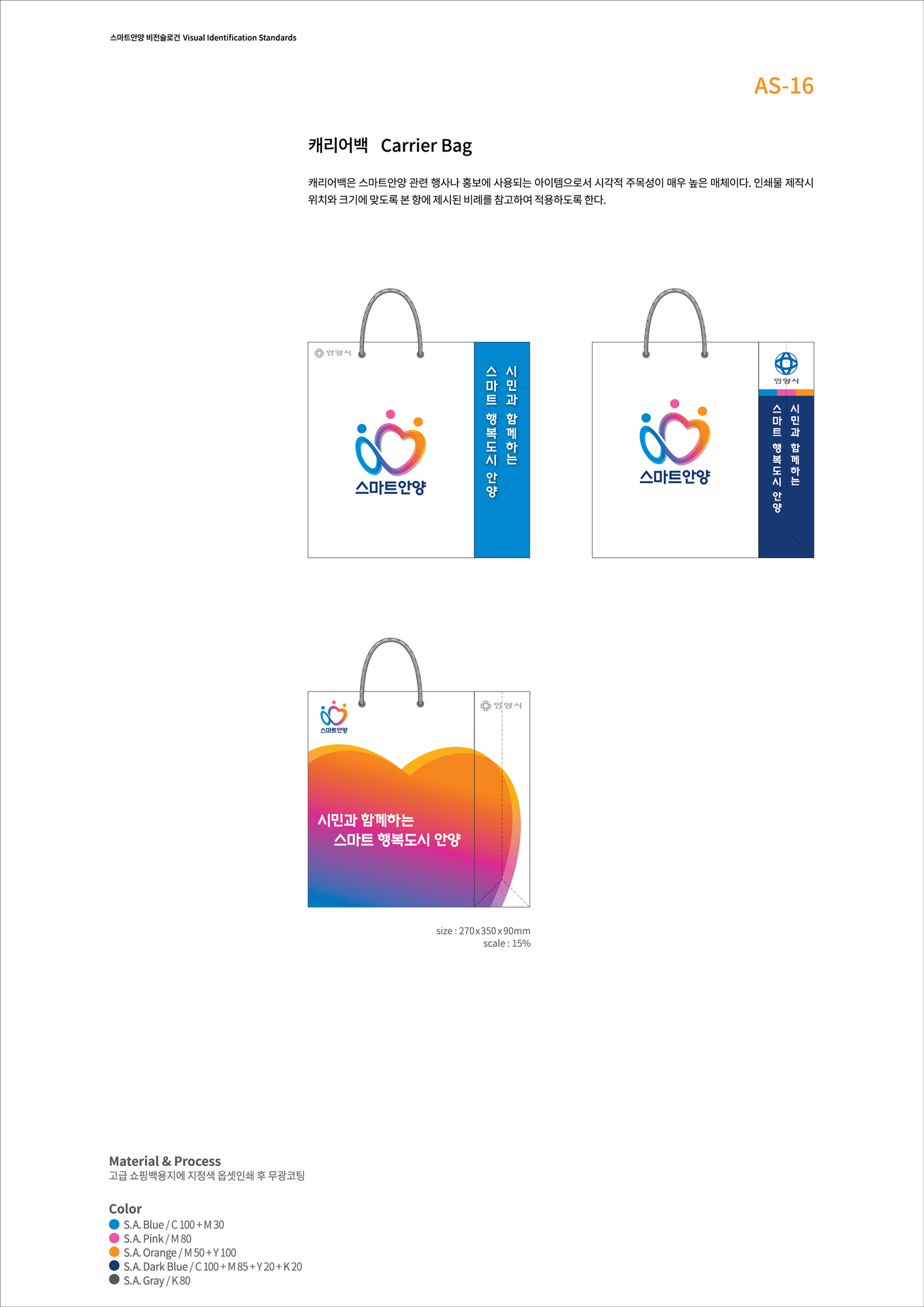 캐리어백은 스마트안양 관련 행사나 홍보에 사용되는 아이템으로서 시각적 주목성이 매우 높은 매체이다. 인쇄물 제작시 위치와 크기에 맞도록 본 항에 제시된 비례를 참고하여 적용하도록 한다.