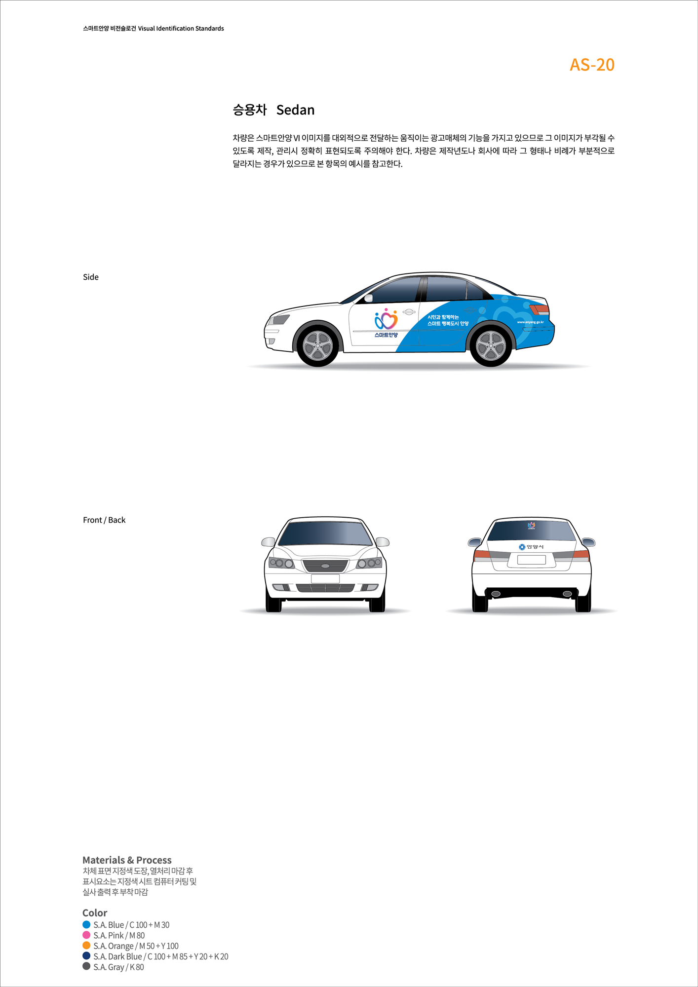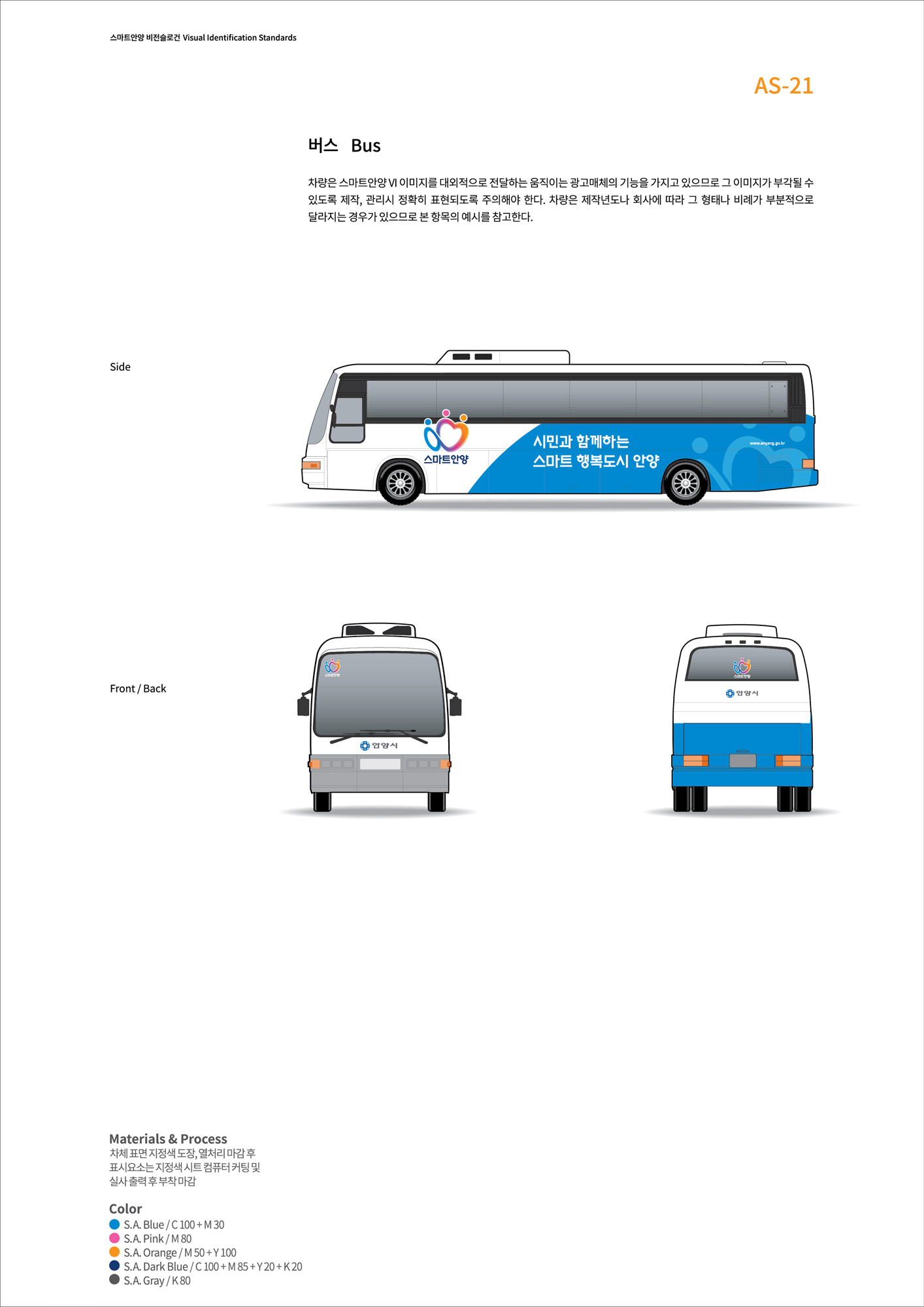 차량은 스마트안양Ⅵ 이미지를 대외적으로 전달하는 움직이는 광고매체의 기능을 가지고 있으므로 그 이미지가 부각될 수 있도록 제작, 관리시 정확히 표현되도록 주의해야 한다. 차량은 제작년도나 회사에 따라 그 형태나 비례가 부분적으로 달라지는 경우가 있으므로 본 항목의 예시를 참고한다.
