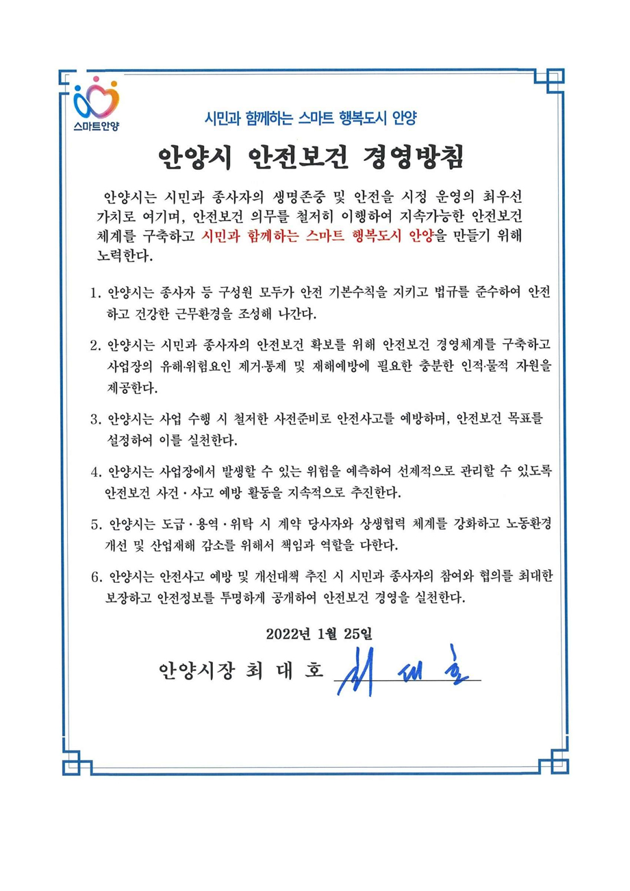 분야별 정보 홈 분야별 정보 재난/안전/민방위 중대산업재해 안전보건 경영방침 공유하기 공유하기 카카오페이지 카카오스토리 트위터 페이스북 네이버 블로그 링크복사 인쇄하기 안전보건 경영방침 안전보건 경영방침 아차사고 및 위험요인 신고 중대산업재해 개요 이미지 확대보기