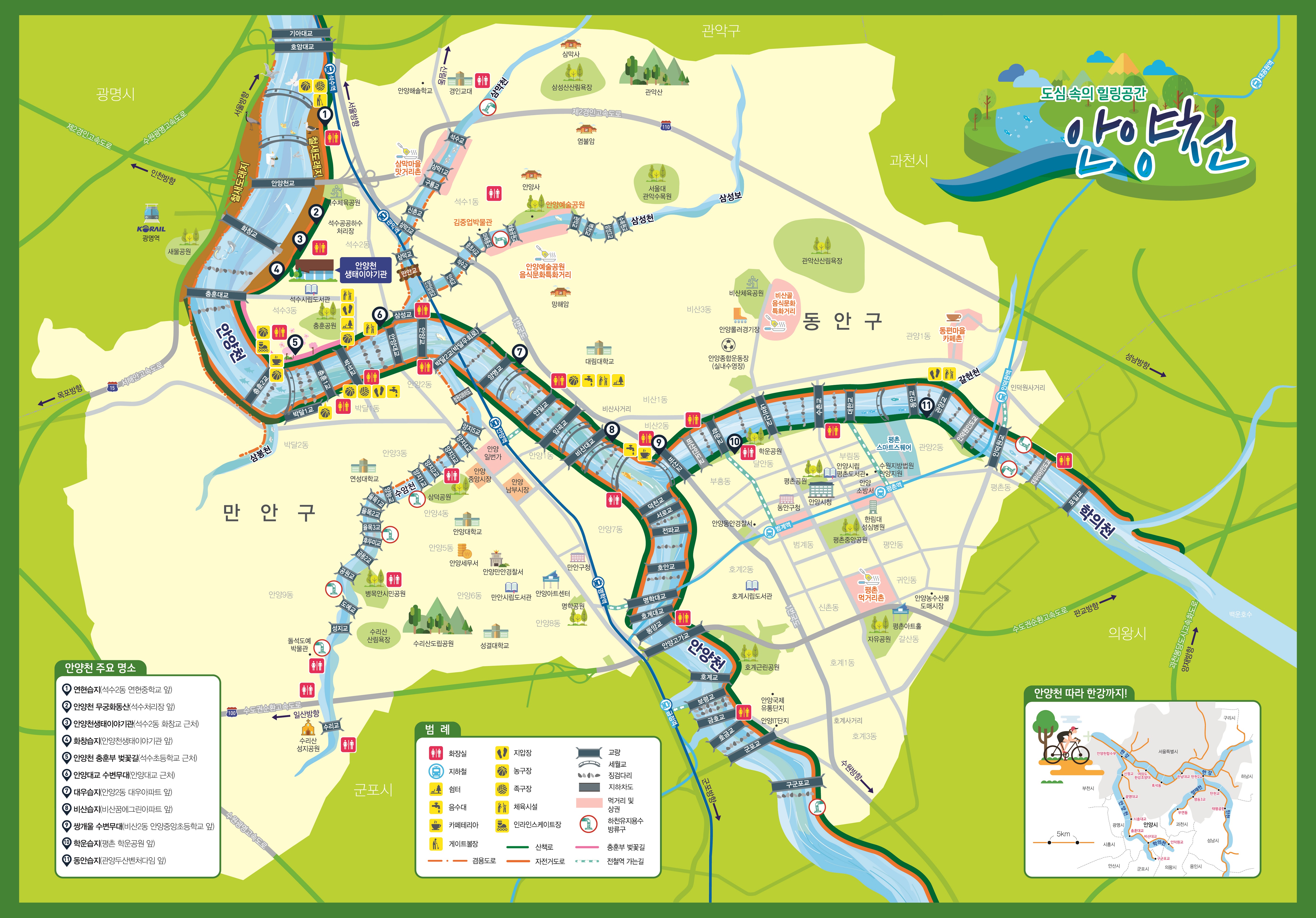 안양천 무궁화동산, 안양천생태이야기관, 안양천 충훈부 벚꽃길, 만안교, 쌍개울 문화광장 연현습지, 화창습지, 대우습지, 비산습지, 학운습지, 동안습지