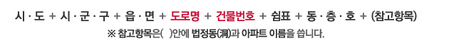도로명과 건물번호 사이는 띄어 씁니다. | 예술공원로103번길 4 (올바른 표기법) | 예술공원로103번길4 (올바르지 않은 표기법) |