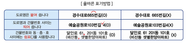 도로명은 붙여 씁니다 | 경수대로665번길 (올바른 표기법) | 경수대로 665번길 (올바르지 않은 표기법) |