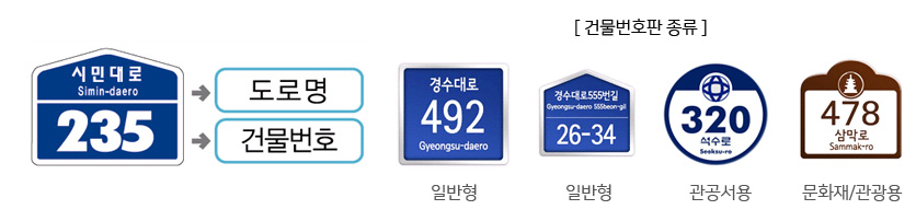 - 건물번호판은 도로명과 건물번호를 표기합니다.