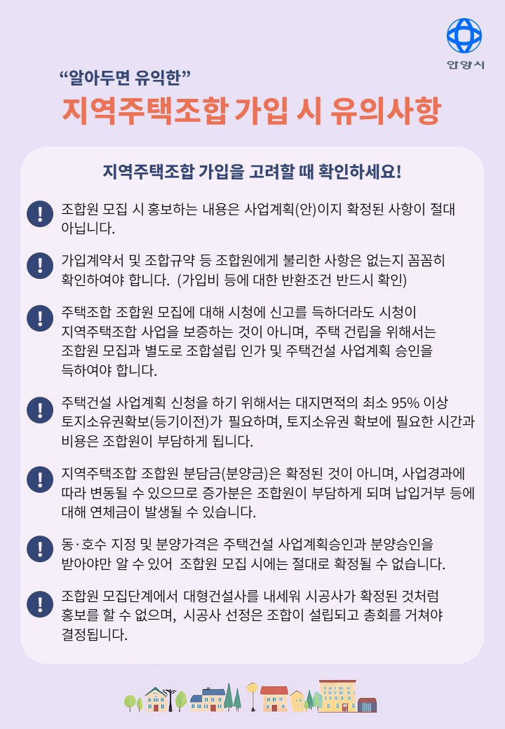 지역주택조합사업으로 인한 선의의 피해를 예방하고자 아래와 같이 유의사항을 안내하오니 조합가입여부를 신중하게 결정하시기 바랍니다.