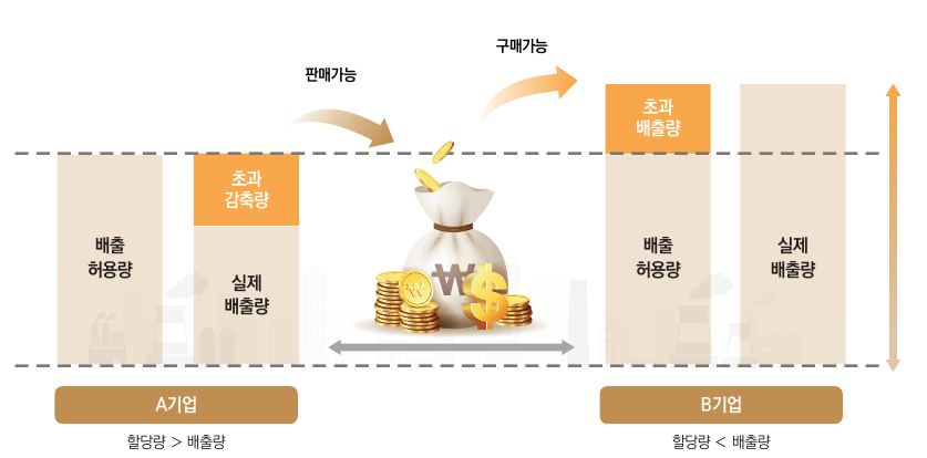 - 국가온실가스 감축목표 달성을 위하여 온실가스 배출허용총량의 범위에서 개별업체에 배출권을 할당하여 그 범위 내에서 배출행위를 허용하고, 여분·부족분에 대해 현금으로 거래를 허용하는 제도