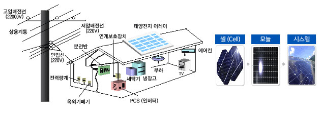 - 태양광 발전시스템은 태양전지(solar cell)로 구성된 모듈(module)과 축전지 및 전력변환 장치로 구성됨