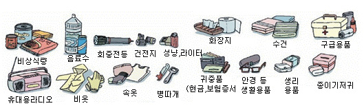 [비상식량 및 식수(약 3일 분량), 휴대용 조명 및 라디오(여분의 건전지), 양초 및 라이터, 약품함, 신발, 안경, 침낭,
