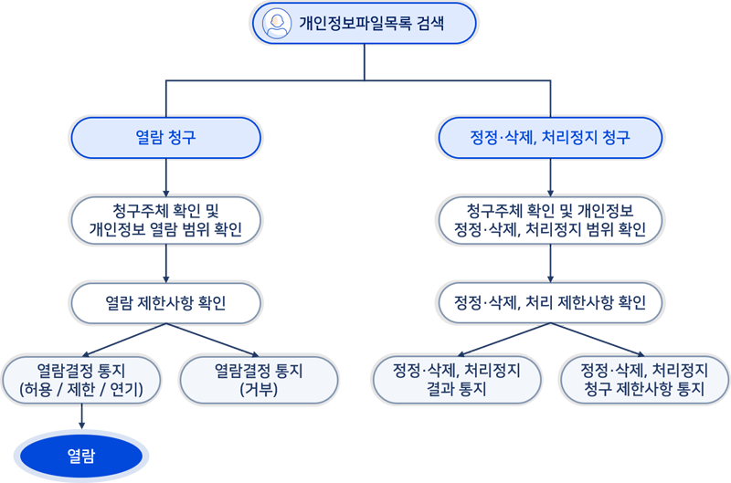 - 정보주체가 개인정보 열람 및 처리 정지를 요구할 권리는 「개인정보 보호법」 제35조 제4항 및 제37조 제2항에 의하여 제한될 수 있습니다.