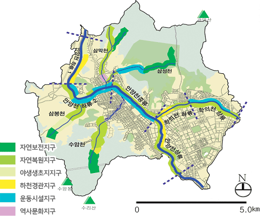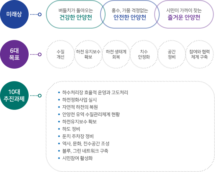 - 수질오염으로 생태계가 훼손된 안양천을 수질개선, 하천 건천화방지, 유량확보, 생태복원 사업을 연차적으로 추진