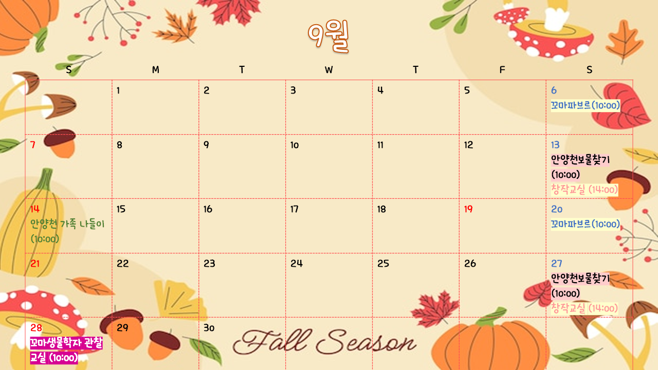 ■ 일자: 9/14(일) ■ 시간: 10:00~11:10 ■ 주제: 안양천의 가을 02. 창작교실 ■ 일자: 9/13, 27 (토) ■ 시간: 14:00~15:00 ■ 주제: 천연염색 03. 꼬마파브르 ■ 일자 : 9/6, 20 (토) ■ 시간 : 10:00~11:30 ■ 주제 : 왕눈이 잠자리 04. 안양천보물찾기 ■ 일자 : 9/13, 27일 (토) ■ 시간 : 10:00~11:30 ■ 주제 : 거미도 곤충도 안양천의 보물 ■ 대상: 초등학교1학년 이상 누구나 05. 꼬마 생물학자 관찰교실 ■ 일자 : 9/28 (일) ■ 시간 : 10:00~11:30 ■ 주제 : 거미는 곤충일까 아닐까? ■ 대상: 초등 1-6학년 *3개월 단위로 참가자 모집 ★ 신청방법: 2025.8.20.(수) 오전 9시 홈페이지 선착순 접수 ★ 참가비: 3,000원 / 1인 ★ 대기신청 및 기타 문의: 안양천생태이야기관 교육 담당자 (031-8045-5204~5) |