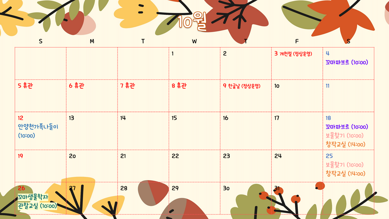 ■ 일자: 10/12(일) ■ 시간: 10:00~11:10 ■ 주제: 안양천의 가을 02. 창작교실 ■ 일자: 10/18, 25 (토) ■ 시간: 14:00~15:00 ■ 주제: 열매리스만들기 03. 꼬마파브르 ■ 일자 : 10/4, 18 (토) ■ 시간 : 10:00~11:30 ■ 주제 : 폴짝폴짝 메뚜기 04. 안양천보물찾기 ■ 일자 :10/18, 25 (토) ■ 시간 : 10:00~11:30 ■ 주제 : 안양천의 가을 보물은 무엇일까요? ■ 대상: 초등학교1학년 이상 누구나 05. 꼬마 생물학자 관찰교실 ■ 일자 : 10/26 (일) ■ 시간 : 10:00~11:30 ■ 주제 : 알록달록 단풍놀이 ■ 대상: 초등 1-6학년 *3개월 단위로 참가자 모집 ★ 신청방법: 2025. 9. 20. (토) 오전 9시 홈페이지 선착순 접수 ★ 참가비: 3,000원 / 1인 ★ 대기신청 및 기타 문의: 안양천생태이야기관 교육 담당자 (031-8045-5204~5) |