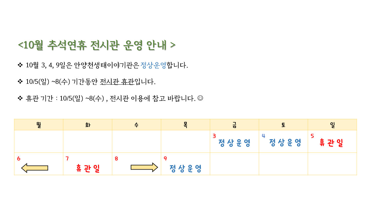 <10월 3일~10월 9일까지 전시관 운영 일정>