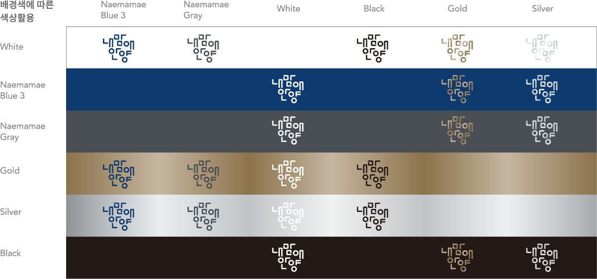흑백 인쇄용 사용시 Namemamae Blue 3은 Gray(K 90%)로 대체하여 사용할 수 있고, Naemamae Gray는 Gray(K 84%)로 대체하여 사용할 수 있다.