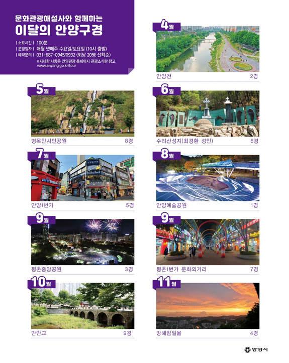 문화관광해설 배경 < 만안교의 밤 >, 안양천 사진공모전 대상, 2019. 배경 < 나무 위의 선으로 된 집 >, 아콘치 스튜디오(비토 아콘치), 2005. 배경 < 지상의 낙원 >, 문주, 2019. 배경 < 너의 거실 >, 천대광, 2019. 배경 안양 파빌리온 전경몰 홈 안양오세요! 토글 안양하세요! 안양보세요! 안양즐겨요! 안양오세요! 문화관광해설 토글 관광종합안내센터 문화관광해설 관광자료실 관광호텔 음식점 관광소식 교통정보 유관기관 링크복사 인쇄 블로그 페이스북 트위터 카카오스토리 카카오톡 이달의 안양구경 안양박물관 구(舊)서이면사무소 기타문화관광해설 이달의 안양구경 “이달의 안양구경” 프로그램은 안양의 주요 관광 명소를 안양시 문화관광해설사의 전문적인 해설을 들으며 도보로 탐방하는 관광프로그램으로,참여하시는 모든 분들께 안양9경을 상징하는 기념품을 드리며 월별 모든 프로그램에 참여하신 분께서는 관광기념품 세트를 추첨해서 드립니다. 이달의 안양구경 해설 신청 신청정보 확인 신청안내 이달의 안양구경 안내 - 운영일자, 예약문의, 내용, 신청인원, 예약시기, 예약방법, 집결장소, 해설시간, 이용료 순으로 정보를 제공 운영기간 4 ~ 11월 운영일자 매월 넷째주 수요일, 토요일 내 용 예약시기 : 매월 1일부터 마감시 까지 신청인원 : 회당 15명 내외 (선착순 모집) 해설시간 : 100분 내외 이 용 료 : 무료 관련문의 - 관광종합안내센터 ☎031-687-0945/0932 - 안양시청 문화관광과 ☎031-8045-5122 프로그램 일정표 이미지 확대보기 문화관광해설사와 함께하는 이달의 안양구경 소요시간 : 100분 운영일자 : 매월 넷째주 수요일/토요일(10시 출발) 예약문의 : 031-687-0945/0932(회당 20명 선착순) ※ 자세한 사항은 안양관광 홈페이지 관광소식란 참고 www.anyang.go.kr/tour 4월 - 안양천 - 2경 5월 - 병목안시민공원 - 8경 6월 - 수리산성지(최경환 성인) - 6경 7월 - 안양1번가 - 5경 8월 - 안양예술공원 - 1경 9월 - 평촌1번가 문화의 거리 - 7경 10월 - 만안교 - 9경 11월 - 망해암일몰 - 4경