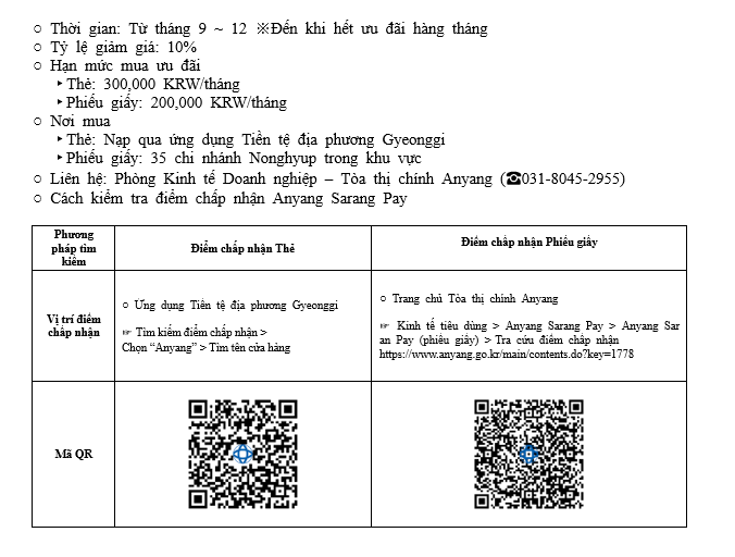 Thông báo Ưu đãi đặc biệt 10% phục hồi dân sinh “Anyang Sarang Pay” | |
